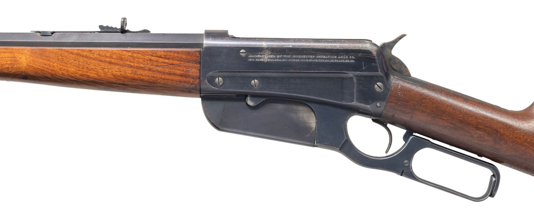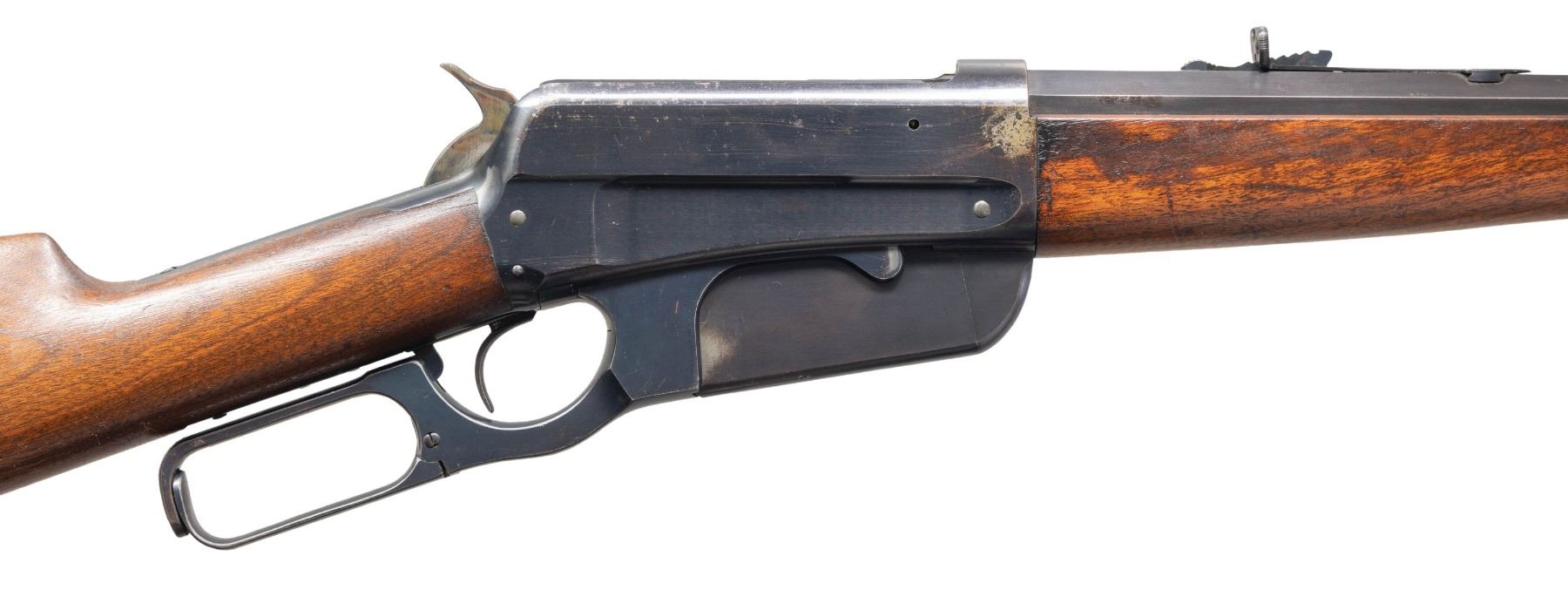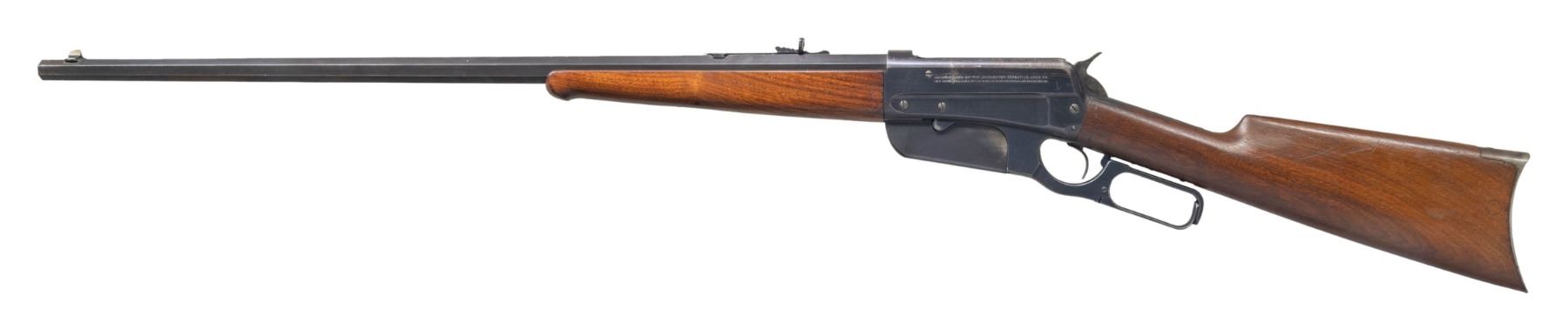 Cal. 38-72 WCF. S# 33129. Bbl. 26" tapered octagon with sporting sights. Blue finish with case colored hammer. Ebony tipped schnabel forearm and straight grip stock with case colored crescent steel buttplate. Mfg. in 1902. CONDITION: over 85% lightly worn blue showing edge and carry wear with small spots of pitting and scratches on the receiver and bbl. Stocks have lightly worn finish showing scattered scratches and marks. Sound mechanics. Very good bright bore. PROVENANCE: The Esteemed Norm Greenberg Collection. (25-4208/DS). CURIO. $2,000-3,500.