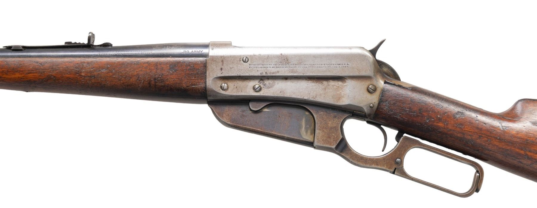 Cal. 30 Army (30-40 Krag). S# 95209. Bbl. 27 7/8". Model 1895 lever action rifle mfg. by Winchester in 1915. Left side of the bbl. is marked ".30 Army" towards the breech. Left side of the receiver is marked with Winchester's 2-line mfg. and patent information. Metal components exhibit a blue finish overall. Plain wood ebony tipped schnabel tip forearm and straight grip buttstock with crescent steel buttplate. Pinned blade front sight with dovetailed V-notch rear sight. CONDITION: receiver has faded to a gray patina, exhibiting consistent light pitting, as well as scattered spots and patches of age related discoloration. Remaining metal components retain fair to good amounts of their original blue finish, exhibiting areas of wear and thinning fading to gray and brown patinas, some superficial handling marks, and light surface oxidation overall. Bright bore, exhibiting consistent light pitting, while retaining strong rifling throughout. Proper manual mechanics. Muzzle exhibits some marring along the lower edge. Wood furniture shows numerous scattered marks and impressions overall. Buttstock exhibits a chip stemming from the receiver on the left side of the wrist, with notable finish loss present on the toeline. (25-4734/MLW). CURIO. $600-900.
