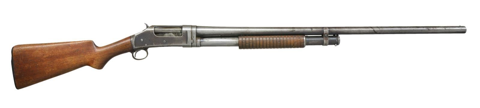 SHOTGUN. Cal. 12 Ga. S# E644588. Bbl. 30". 2 3/4" Chamber. Full choke. Takedown. Bbl. markings include "The Winchester Repeating Arms Co.", address & patent dates. Slide bar marked "MODEL 1897" & "WINCHESTER". Gold colored bead front sight. Grooved walnut slide handle. Walnut buttstock w/ unmarked hard rubber buttplate. CONDITION: buttstock & slide handle have wear, dents, thinning finish, staining & scratches throughout. Sm. crack behind receiver on right side. Slide handle has scattered sm. missing chips. Metal retains sm. degree of original blue finish in protective areas. Balance of finish turning overall gray & patina w/ areas of oxidation & very fine pitting. Receiver has scattered sm. dents & scratches on both sides. Takedown feature is slightly loose. Bore has degree of shine w/ scattered shallow pitting. (21-4329/RW). CURIO. $200-300.