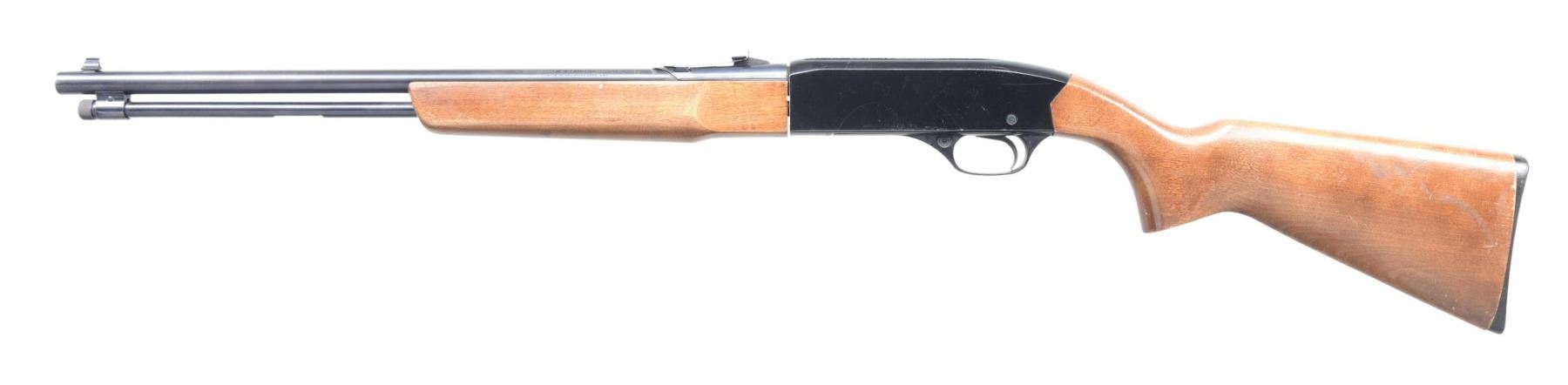 Cal. 22 L & LR. S# B1123327. Bbl. 20 1/4". Model 190 semi-automatic rifle mfg. by Winchester circa. 1974-1980. Left side of the bbl. is marked with the Winchester trademark logo, followed by the cal. and model designations, above Winchester's mfg. information. Aluminum receiver and lower assembly exhibit a black finish, with the bbl. and mag. tube exhibiting a blue finish. Plain wood pistol grip buttstock and forend. Blade front sight with U-notch rear sight. CONDITION: metal components retain the majority of their original factory finishes, with scattered superficial handling marks present overall. Bbl. and mag. tube exhibit scattered spots of mild surface oxidation. Mirror bore, exhibiting well defined rifling throughout. Wood furniture shows scattered marks and minor impressions from handling and storage, but otherwise remain sturdy and serviceable. PROVENANCE: The Estate Collection of Charles Wagner. (24-4606/MLW). MODERN. $150-300.