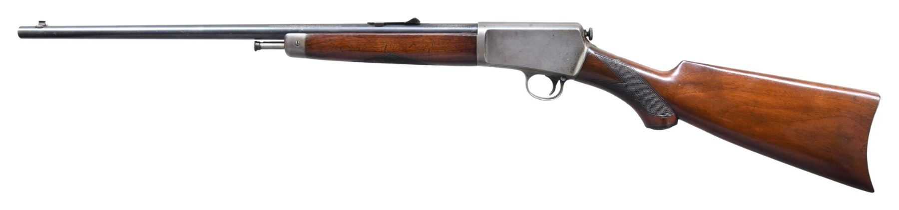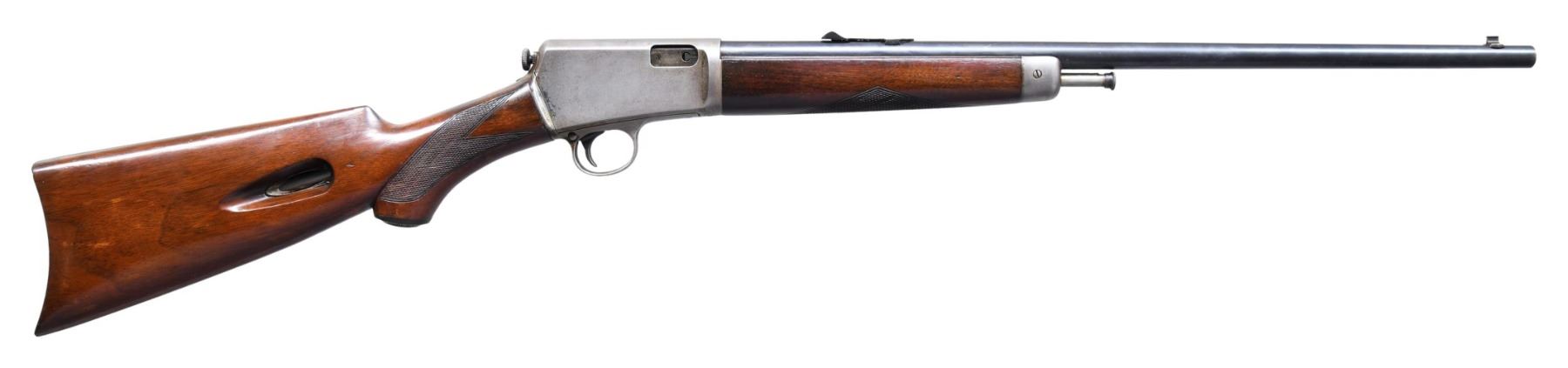 Cal. 22 Auto. S# 98138. Bbl. 20". Model 1903 semi-automatic rifle mfg. by Winchester in 1915. Left side of the bbl. exhibits standard factory markings denoting Winchester's mfg. and patent information, as well as the model and cal. designations. Bbl. exhibits a blue finish overall, with the bolt being polished in-the-white. Checkered wood pistol grip buttstock and forend, with crescent buttplate and Winchester hard rubber grip cap. Dovetailed blade front sight, with dovetailed U-notch rear sight. Matching numbers are present on the upper and lower assemblies. CONDITION: upper and lower assemblies retain a dull gray patina, with light pitting present overall. Bbl. exhibits some spots of light to mild wear and thinning, some scattered superficial handling marks, as well as areas of light surface oxidation overall. Bore exhibits areas of deep and dark pitting, while retaining good to strong rifling throughout. Wood furniture shows scattered marks from handling and storage, but otherwise remains sturdy and serviceable. PROVENANCE: Estate of Russell Dickerman. (25-1807/MLW). CURIO. $500-800.
