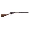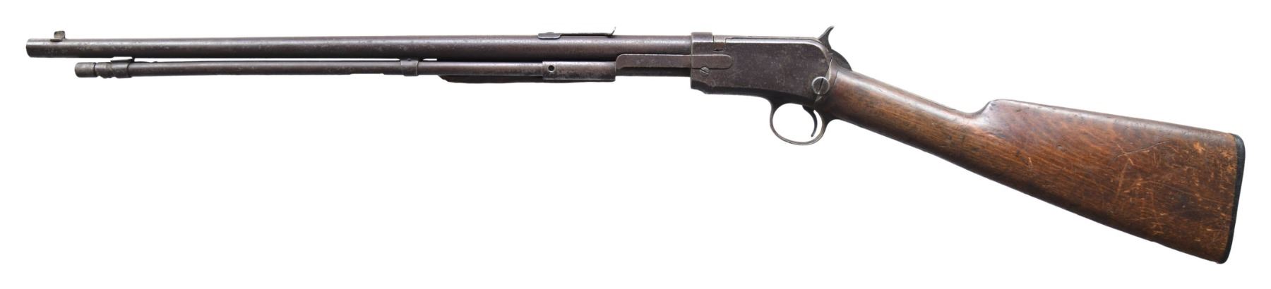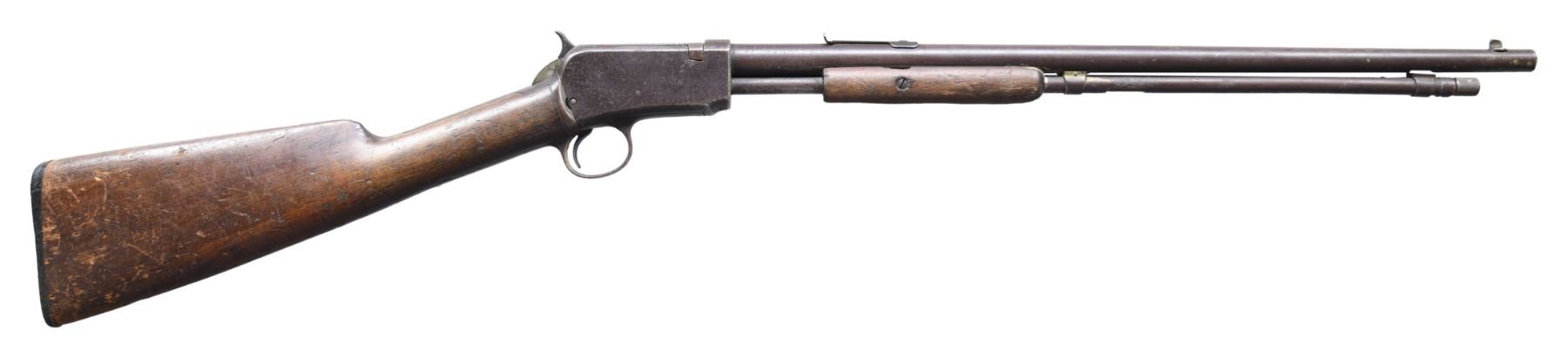 Cal. 22 S, L, LR. S# 377189B. Bbl. 20". Model 1906 slide action rifle mfg. by Winchester in 1913. Left side of the bbl. is marked with Winchester's mfg. and patent information, followed by "MOD.1906", with the cal. designation marked at the breech. Plain wood straight grip buttstock, with partial plain wood pump (left half is absent). Dovetailed blade front sight, with V-notch rear sight. Matching numbers are present on the upper and lower assemblies. CONDITION: metal components retain a dark gray patina, exhibiting varying degrees of oxidation and pitting overall. Bbl. is plugged with an unidentified material at the muzzle, and bore condition cannot be checked. Buttstock exhibits numerous marks and impressions from handling and storage, with some minor chipping. Right half of pump exhibits scattered handling marks and some chipping. (25-1543/MLW). CURIO. $150-250.