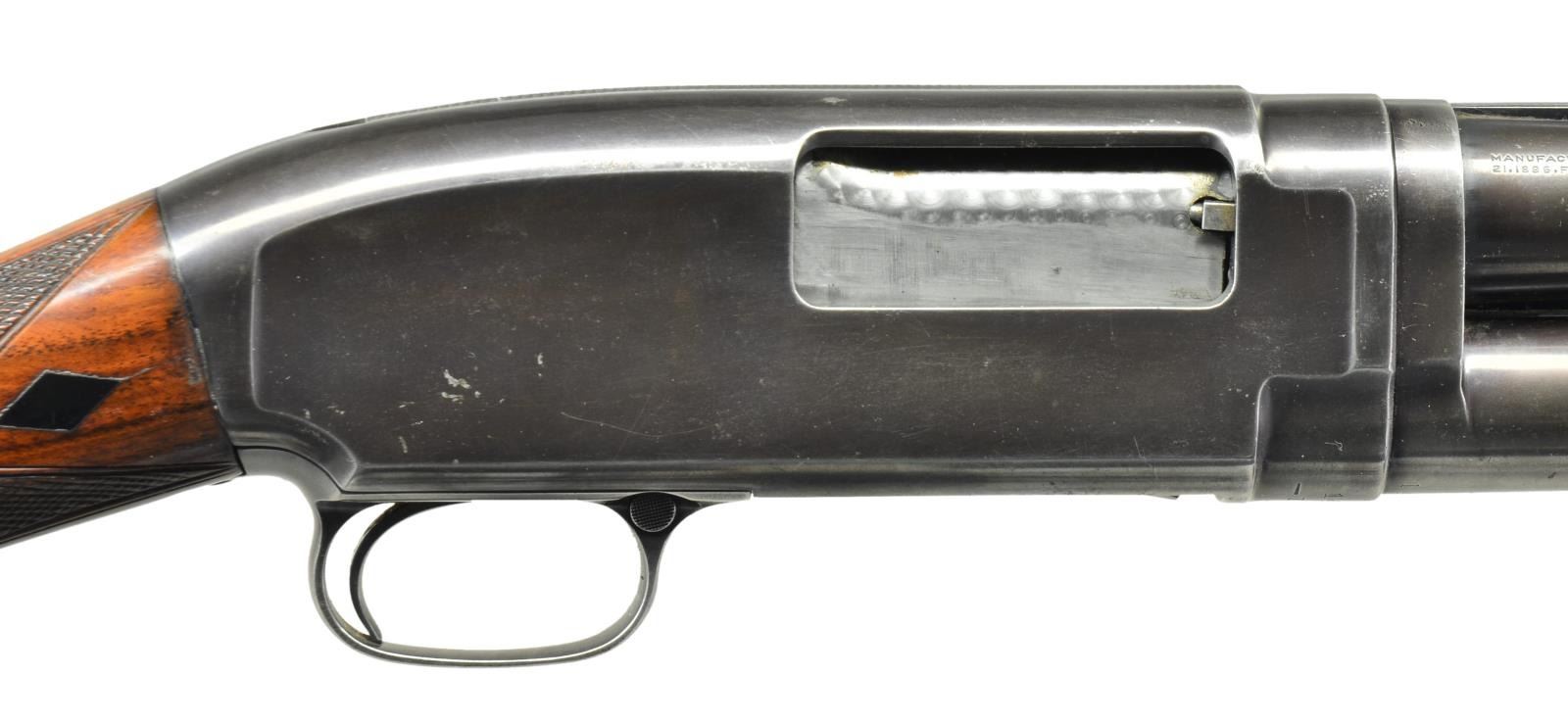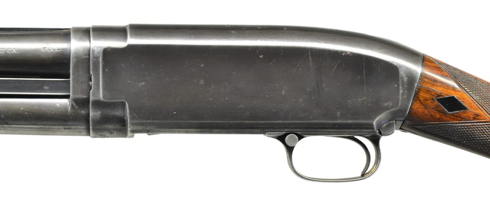 PUMP SHOTGUN. Cal. 12 Ga. S# 147963. Bbl. 30" nickel steel w/ solid rib & fixed full choke. Brass front bead w/ broken mid bead. Receiver below S# is marked "TRAP". Bolt & carrier have added jeweling. Sm. rnd. forend & straight grip stock of fancy walnut w/ trap grade checkering & Black Diamonds. LOP shortened to 13 3/8" over an aftermarket Red Head pad. Mfg. 1917. CONDITION: 60% faded reblued finish. Forearm has worn original finish & checkering showing handling marks. Refinished stock has lower comb & recut checkering w/ sm. cracks in action area. Good mechanics. Headspace ring is taken up 3 notches. Bbl. shows light pitting & fouling forward of chamber. (21-2351/DS). CURIO. $600-900.