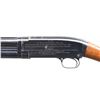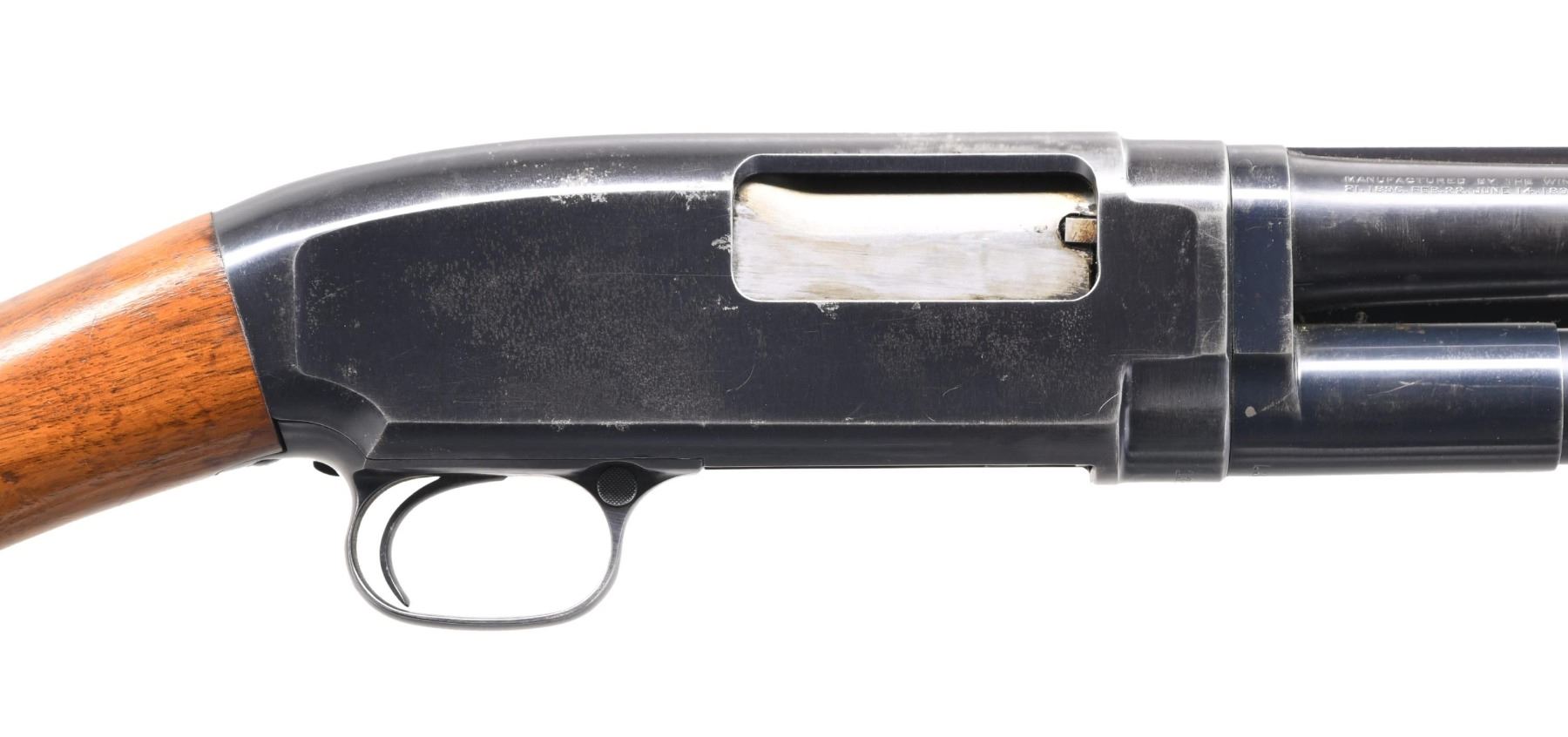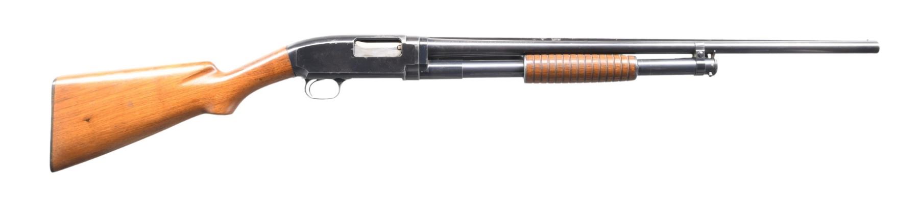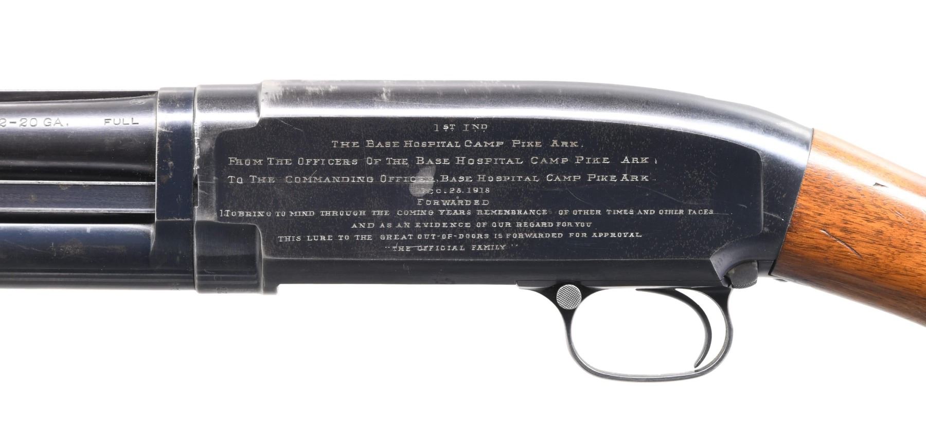 PUMP SHOTGUN. Cal. 20 ga. S# 136828. Bbl. 25" of nickel steel w/ fixed full choke. Brass front bead. Small round grooved forearm & early style pistol grip stock w/ original buttplate. Mfg. 1917. Presented to the base commander at Camp Pike Arkansas on December 25th, 1918 from the base hospital staff. Left side of receiver has engraved markings & regards. CONDITION: very good retaining over 90% original blue showing small spots of corrosion & edge wear w/ takedown mark on left side of action. Original wood finish shows light wear w/ scattered scratches & marks. Very good bright bore. Sound mechanics. PROVENANCE: The estate collection of Don "Duck" Combs. (24-2518/DS). CURIO. $1,000-1,500.