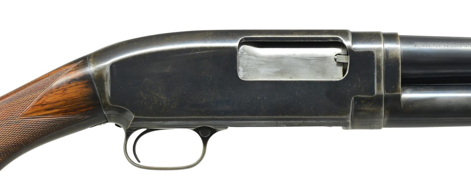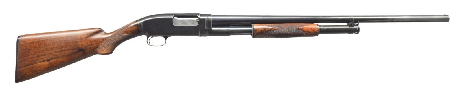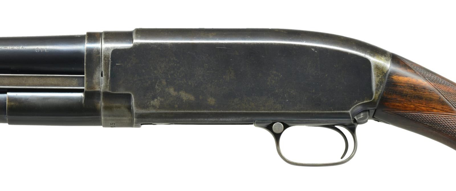 Cal. 12 Ga. S# 205915. Bbl. plain of Nickel Steel w/ added full length matting is shortened to 27". Factory choke marking is "CYL". Brass front bead. Sm. rnd. forearm of fancy walnut has wrap around Pigeon grade hand checkering. Field stock w/ early style pistol grip has added checkering. LOP: shortened to 13 5/8" w/ reattached buttplate. CONDITION: action & mag. tube assembly retain 70% dull faded blue showing carry wear & spots of flaking. Bbl. retains 95% lightly faded reblued finish. Stock & forearm have good refinish. Forearm has a crack at rear edge along left bbl. channel. Bore shows spots of pitting. (21-2291/DS). MODERN. $350-500.