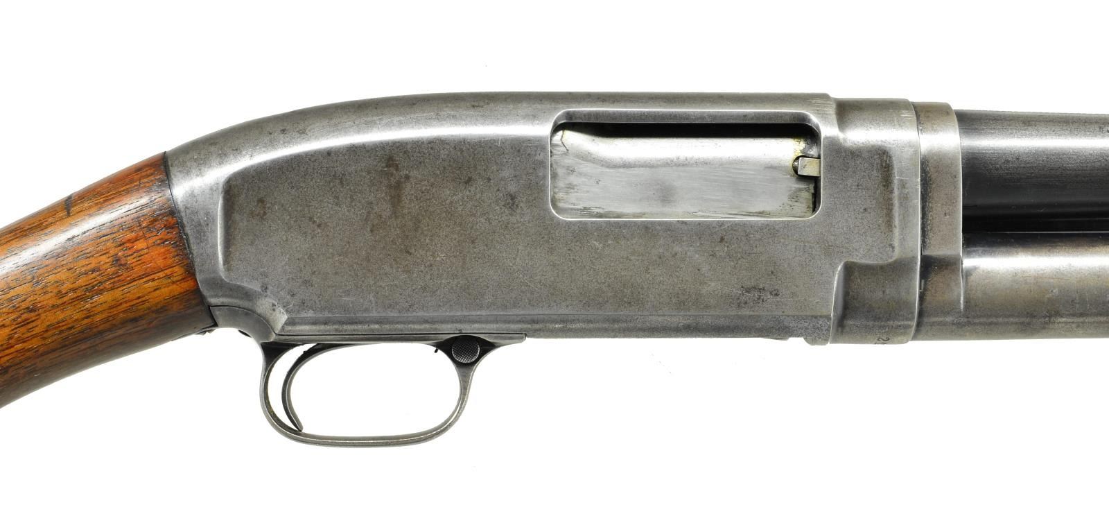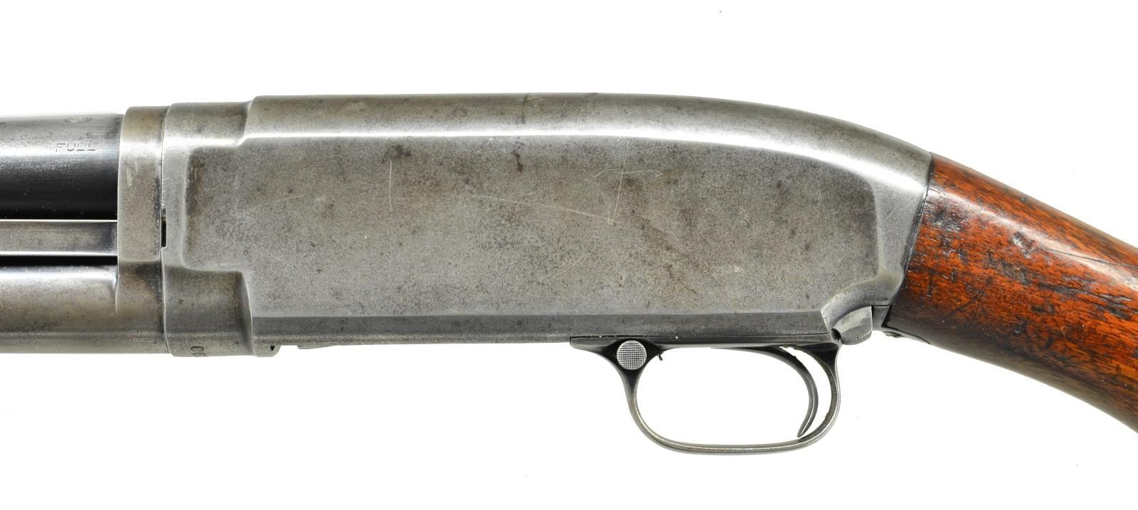 Cal. 12 Ga. S# 218290. Bbl. 30" Nickel Steel w/ aftermarket full length matted top. Fixed Full choke & brass bead. Sm. rnd. grooved forend & early style pistol grip stock w/ original buttplate. Mfg. 1919. CONDITION: bbl. retains 70% lightly faded blue. Action & mag. tube are fading to gray. Wood has heavily worn & peeling original finish showing numerous dents & marks. Hammer will drop before action is closed & must be repaired to be safe. Bore shows sm. dark spots. (21-2269/DS). CURIO. $300-450.