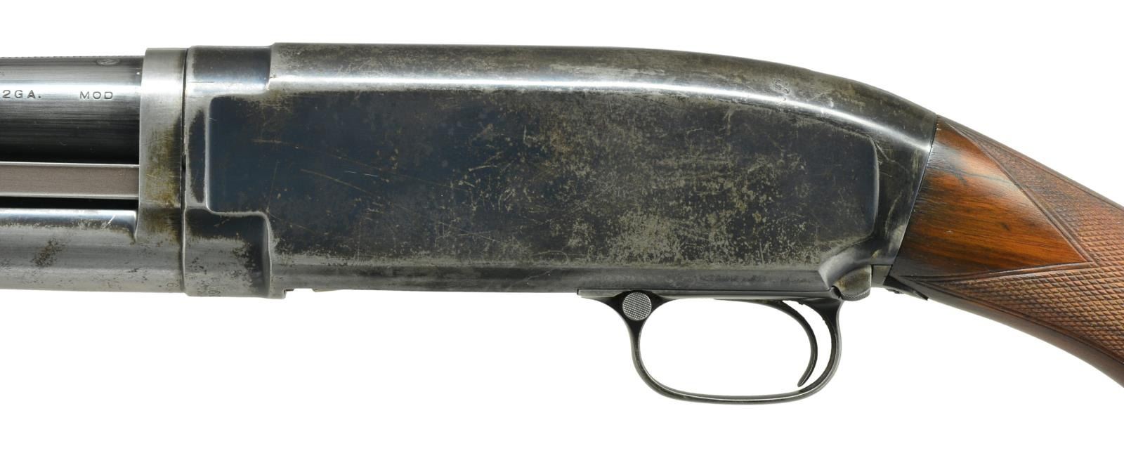 Cal. 12 Ga. S# 125309. Bbl. 28" of Nickel Steel w/ fixed Mod. choke & steel bead. Top of bbl. has added matting. Sm. rnd. walnut forearm w/ Tournament grade checkering. Early style pistol grip stock w/ added Tournament grade checkering. LOP: 13 5/8" over proper style buttplate. 1916 Mfg. CONDITION: 60% dull worn blue w/ flaking, sm. spots of pitting & areas of abrasive cleaning. Good bright bore. (21-2336/DS). CURIO. $300-500.