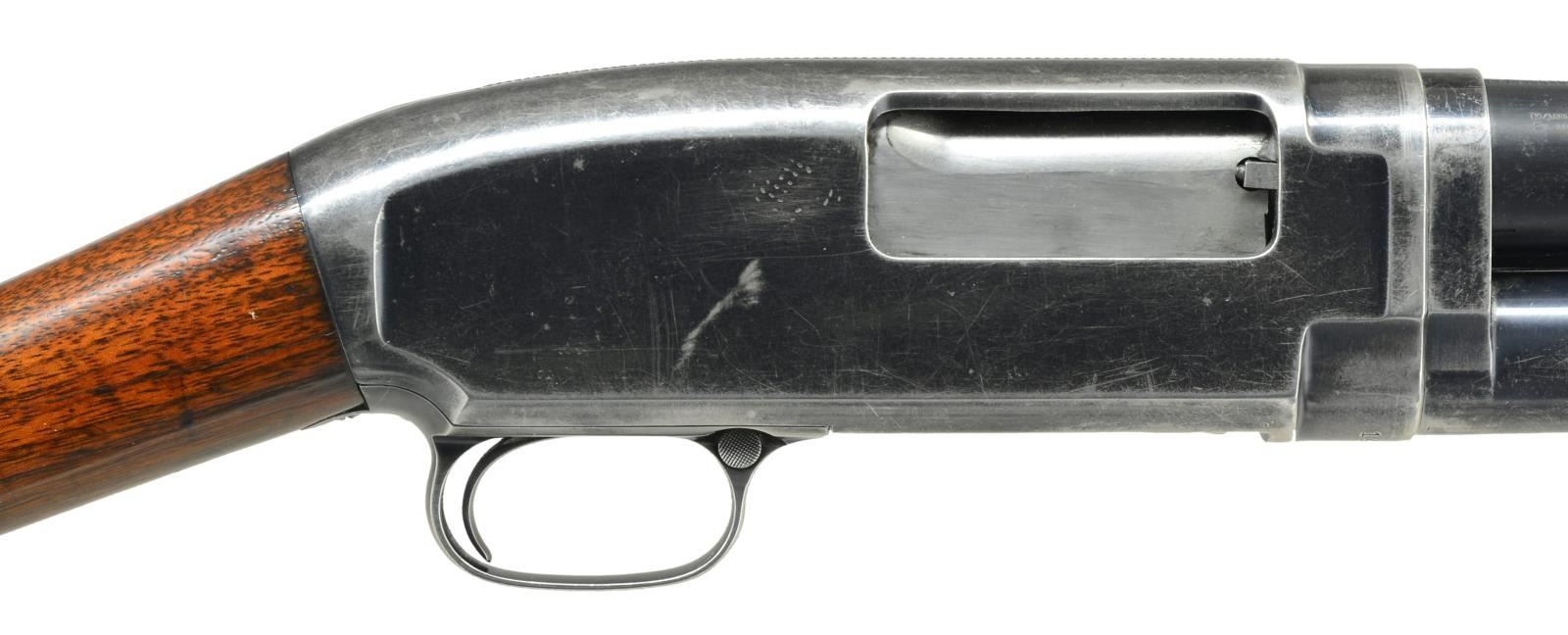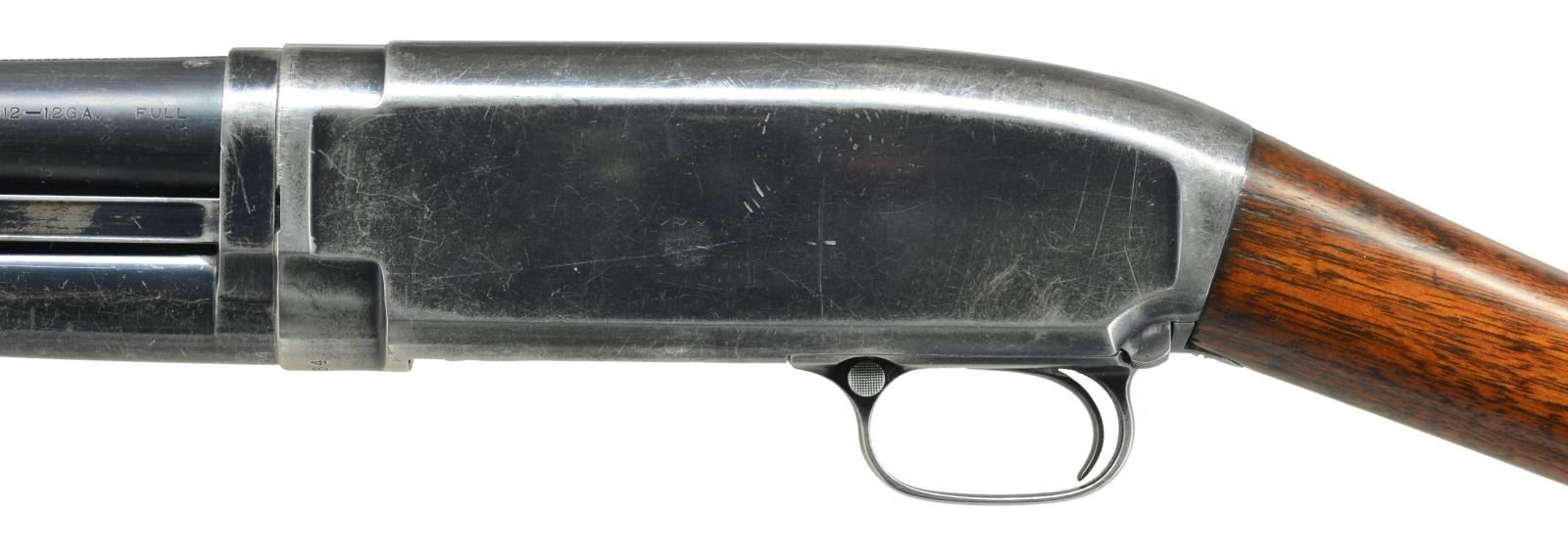 Cal. 12 Ga. S# 146764. Bbl. Nickel Steel shortened to 28" w/ cyl. bore. brass bead. Top of bbl. has added matting. Original choke marking "FULL". Sm. rnd. grooved forearm & straight grip walnut stock. LOP: 13 5/8" over original buttplate. 1917 Mfg. CONDITION: has lg. area of deep pitting on one side. 60% Lightly faded blue showing wear & scratches w/ light vice marks on receiver. Forearm has worn finish showing scratches & marks. Sanded & refinished stock shows scratches & marks w/ cracks extending from right side of receiver & trigger guard tang. (21-2337/DS). CURIO. $300-500.
