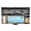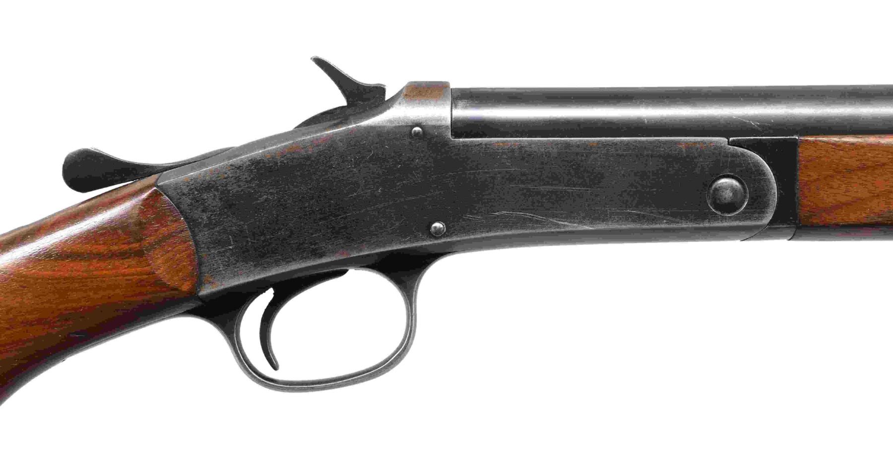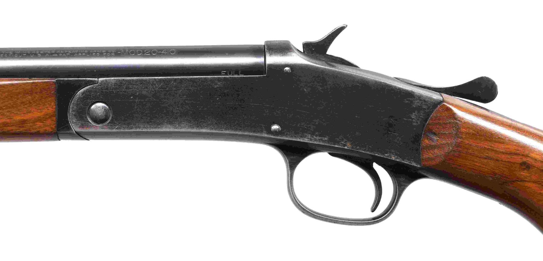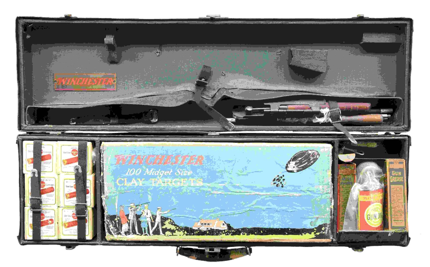Cal. 410, 2 1/2". S# 12259. Bbl. 26" w/ fixed full choke & brass bead. Blue finish. Schnable tipped walnut forearm & pistol grip stock w/ original buttplate. Only 23,616 mfg. 1919-24. UNATTACHED ACCESSORIES: black composite junior shooting outfit case w/ green fitted interior. Case contains cardboard box for Winchester midget size clay targets w/ colorful shooting picture. Box shows light wear & contains 2 examples of the miniature targets. Ammo in the case consists of six sealed boxes of Remington UMC 410 2 1/2" no. 7 1/2 shot w/ blue & white labels picturing the red cartridges. Other accessories in the case include target thrower, oil bottle, rust remover in cardboard tube, gun grease in cardboard tube, 3 piece wooden cleaning rod, cleaning swabs & patch jag, pad of score sheets, instruction manual & detached brass label w/ red Winchester markings. Box interior & exterior shows light wear. Handle is missing parts of leather covering. CONDITION: gun retains over 70% blue showing fading on action from carry wear. Original wood finish shows scattered scratches & marks. Sound action. Bright near excellent bore. (24-2040/DS). CURIO. $2,500-3,500.