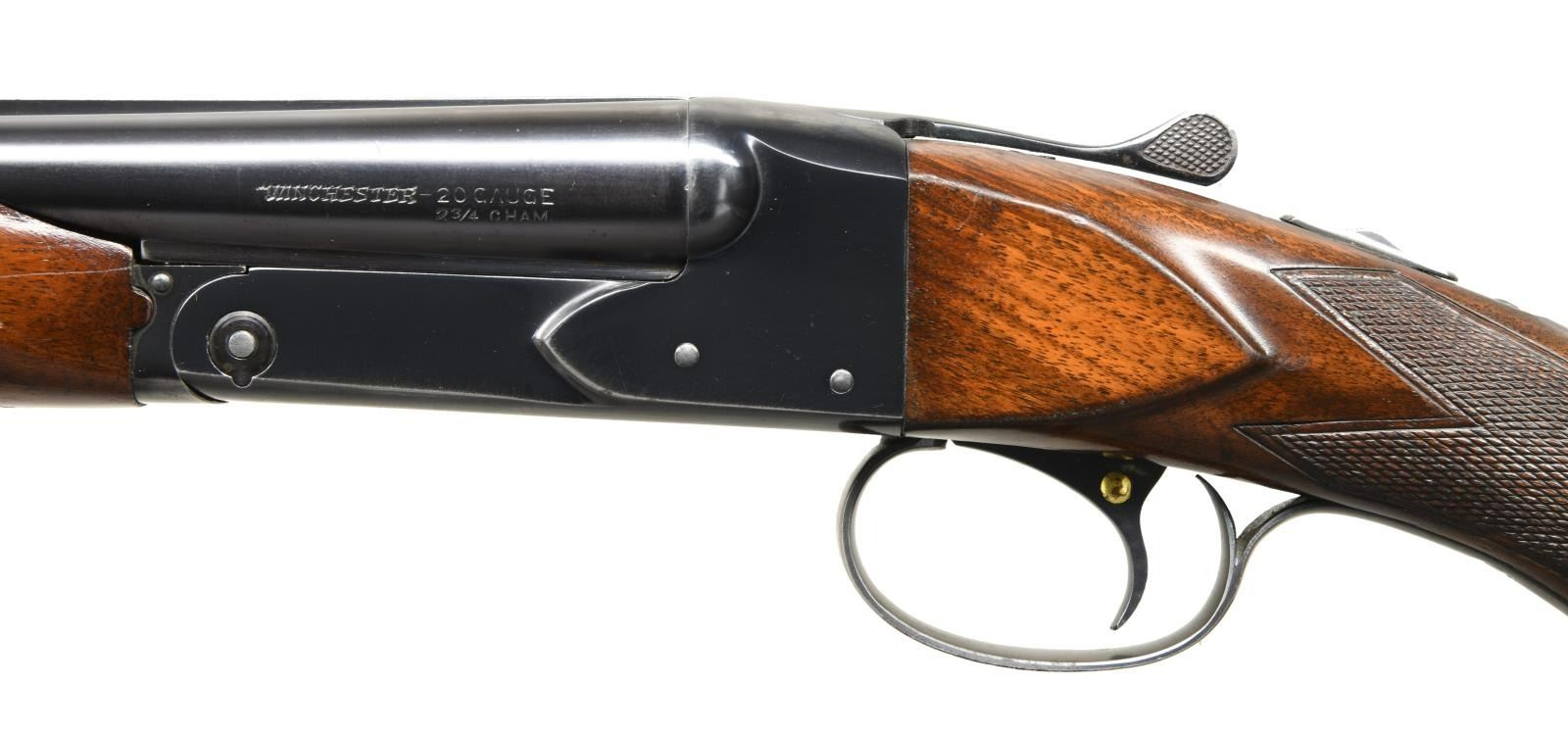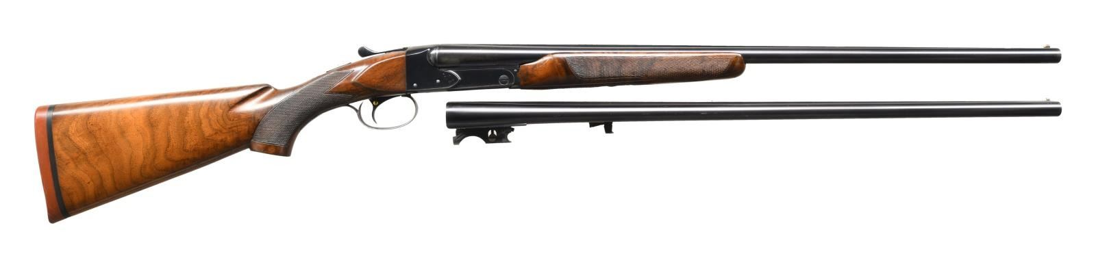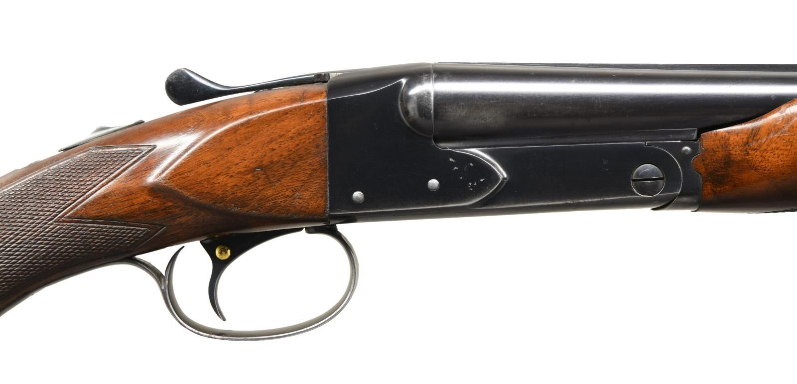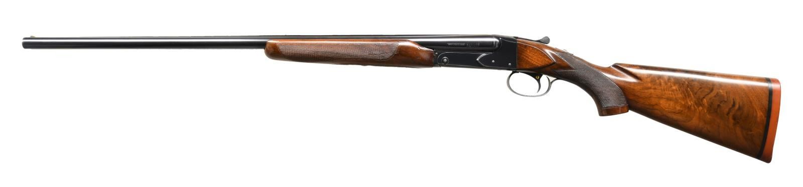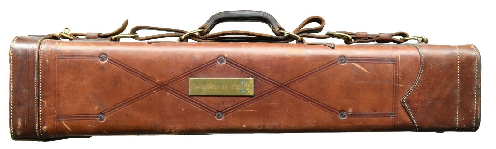 Cal. 20 ga. 2 3/4". S# 15903. Bbls 1. 26" w/ broken target front sight. Fixed Skeet & Skeet chokes. Bbls 2. 26" w/ white target front sight. Fixed Imp-Cyl. & Mod chokes. Blue boxlock action w/ ejectors & single selective trigger. Beavertail forearm & uncapped pistol grip walnut stock w/ Kidney pattern checkering. LOP: 14 1/4" over solid red Winchester pad. DAC: 1 5/8". DAH: 2 3/8". Neutral cast. WEIGHT: 6 lbs, 11.4 oz. UNATTACHED ACCESSORIES: leather 2 bbl. set motoring case. Brass nameplate is marked "W. A. Patterson". CONDITION: Both sets of bbls. retain over 90% blue. Action has 80% blue w/ carry wear, slight fading on floor plate & light pitting along left trigger guard edge. Wood has moderately worn finish showing some age darkening showing scattered marks & small dents. Checkering shows moderate wear. All bores are very good & bright. (23-4801/DS). CURIO. $6000-8000.