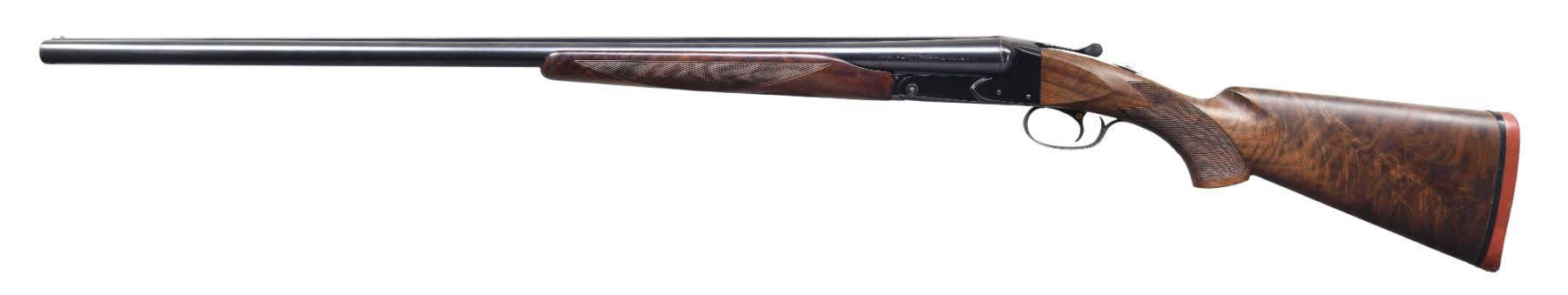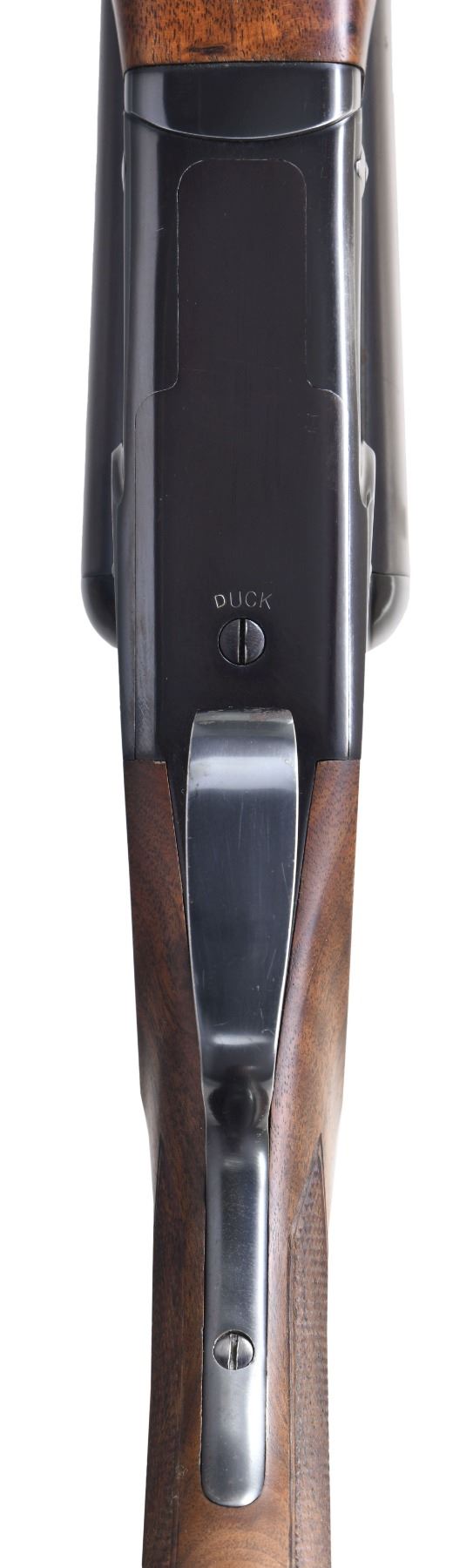 Cal. 12 ga. 3". S# 30777. Bbls. 30" w/ fixed Mod & Full chokes. Steel front bead. Floorplate is marked "DUCK". SST. Ejectors. Original forearm w/ diamond pattern checkering. Uncapped pistol grip replacement stock of fancy walnut w/ hand checkering. LOP: 14 1/4" over age hardened solid red pad. DAC: 1 5/8". DAH: 2 1/2". Neutral cast.. WEIGHT: 7 lbs, 13.8 oz. CONDITION: bbls. & action retain 98% reblued finish. Forearm has good satin refinish w/ freshened checkering. Stock has very good satin finish & checkering. Sound mechanics. Very good bright bores. (25-765/DS). CURIO. $3,000-5,000.