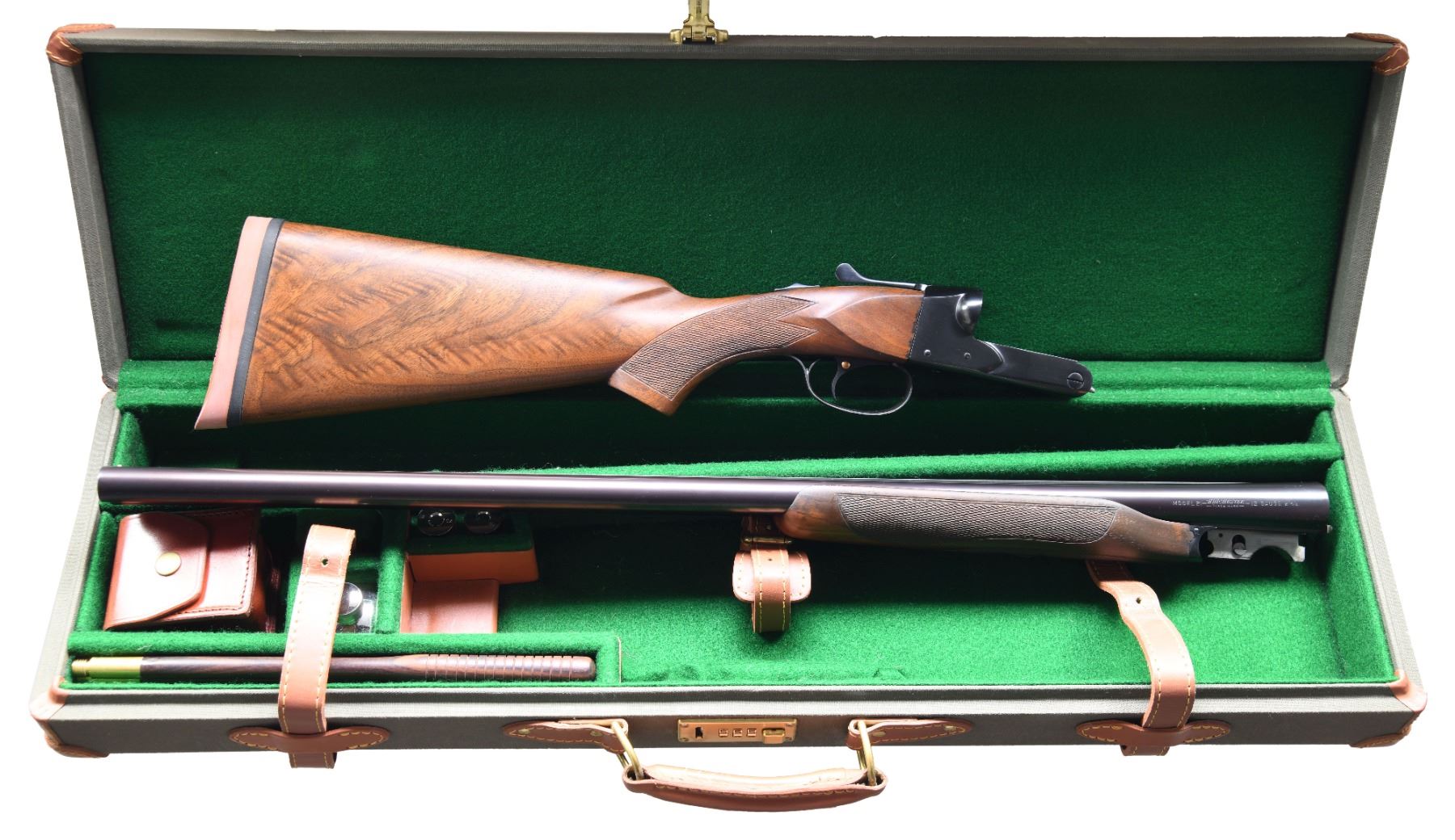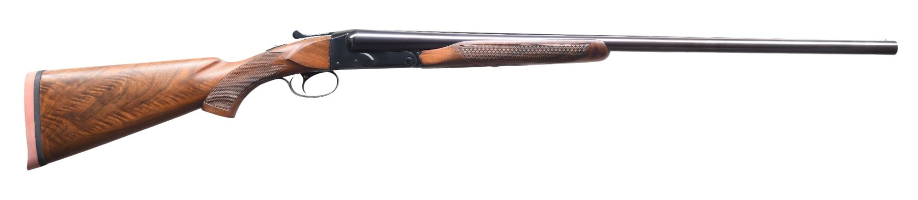 Cal. 12 ga. 2 3/4". S# 24856. Bbls. 28" w/ steel bead. Fixed Mod & Full chokes. Blued boxlock action w/ ejectors & single selective trigger. Beavertail forearm w/ kidney pattern checkering & uncapped pistol grip stock of checkered walnut. LOP: 14 5/16" over an aftermarket solid red pad. UNATTACHED ACCESSORIES: modern canvas covered leather trimmed takedown luggage case w/ green velour fitted interior. Case contains 3 piece ebony cleaning rod, leather pouch of cleaning brushes/accessories, silver finished oil bottle, snap caps & an original Model 21 catalog. Also included in an invoice dated 12/28/2009 from Simmons of Olathe, KS. Invoice lists work completed as reblue, install reproduction pad & refinished stock/forearm. Total cost: $795. CONDITION: over 99% refinished wood & metal. Bores show some light pitting. Action is tight. (24-2937/DS). MODERN. $1,500-2,500.