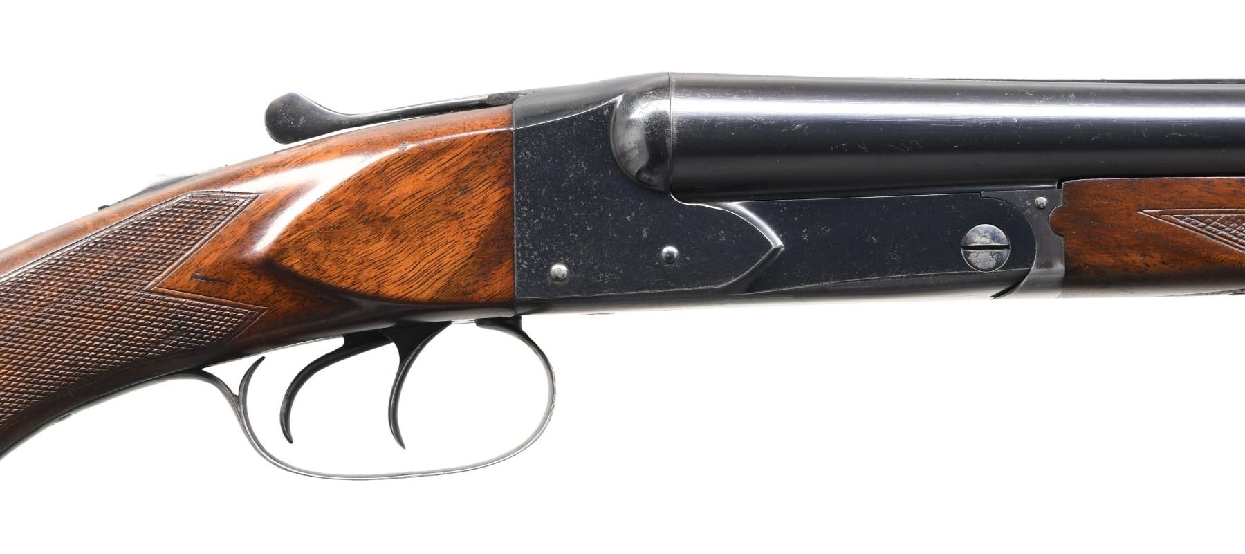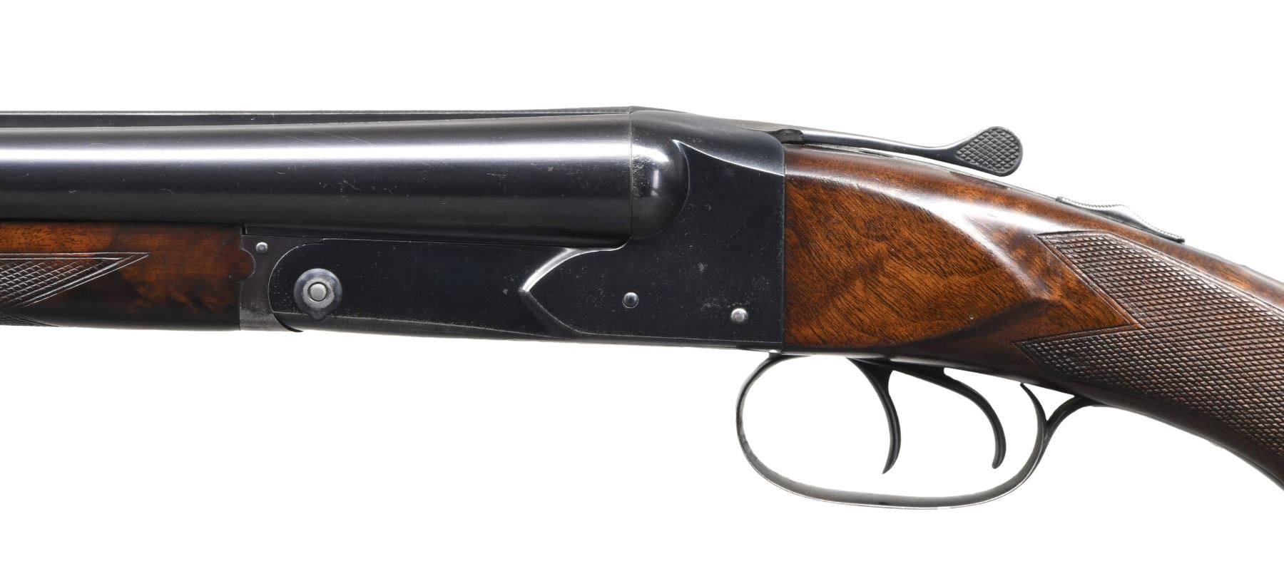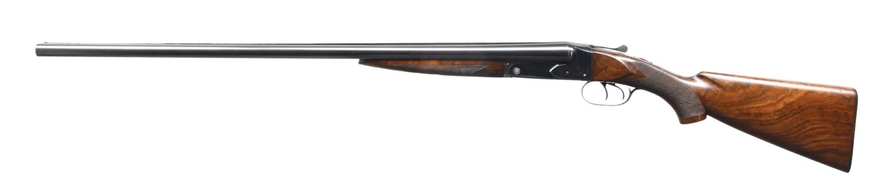 Cal. 16 ga. 2 3/4" chambers. S# 6773. Bbl. 28" of Winchester proof steel w/ fixed mod & full chokes. Steel front bead. Blued boxlock action w/ double triggers & selective ejectors. Splinter forearm & uncapped pistol grip stock of fancy walnut w/ hand checkering. LOP: 14" over original buttplate. DAC: 1 9/16". DAH: 2 1/2". Neutral cast. Bore diameter: Rt .669 Lt .668. Choke constriction: Rt .013 Lt .029. Minimum wall thickness: Rt .030 Lt .030. WEIGHT: 6 lbs. 8.9 ozs. UNATTACHED ACCESORIES: Cody Firearms Museum letter stating: "Standard Grade / Symbol: G2153B / 16 gauge / Barrel Length: 28 inches / Right Barrel: Modified, Left Barrel: Full / Automatic safety / Double trigger / Selective ejector / Pitch: Regular, Pull: Regular, Drop at heel: Regular, Drop at comb: Regular / Regular finish / Grade of wood: Regular / Made for: Stock / Order number: G21B / Inspection started: April 16, 1935 / Inspection finished: June 19, 1937 / No other information is available for this serial number." CONDITION: over 95% bbl. blue. Action has 70% original blue showing edge & carry wear with floorplate, forend iron & top lever flaking to brown. Original wood finish shows light wear with scattered scratches & small dents. Tight sound action. Very good bright bores. (24-5871/DS). CURIO. $5000-7000.