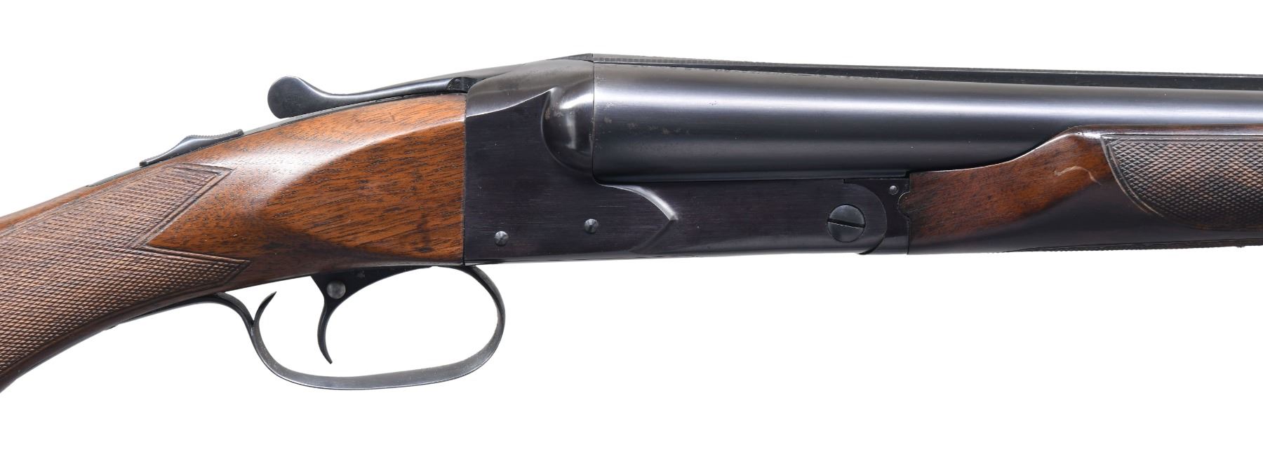 Cal. 12 ga. 2 3/4". S# 3859. Bbls. 30" w/ fixed Mod & Full chokes. Replacement white front bead. SST. Ejectors. Replacement beavertail forearm w/ kidney pattern checkering. Original early style uncapped pistol grip stock w/ standard checkering. LOP: altered to 13 1/2" over a reproduction solid red pad. DAC: 1 3/4". DAH: 2 1/2". Neutral cast. WEIGHT: 7 lbs, 9.2 oz. CONDITION: bbl. & action have over 98% reblued finish. Refinished stock & forearm have freshened checkering. Sound mechanics. Bores show some spots w/ lightly darkened appearance. (25-762/DS). CURIO. $2,000-3,500.