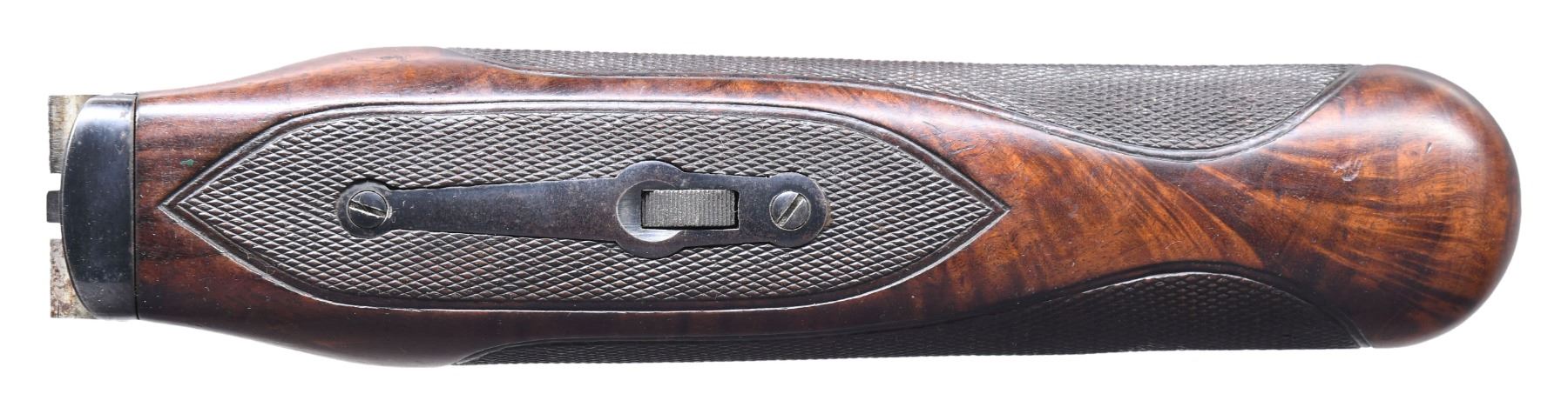 Cal. 20 ga. 2 3/4". S# 16061. Bbls. 26" w/ fixed Imp-Cyl. & Imp-Mod chokes. Steel front bead. Blue finished boxlock action w/ SST & ejectors. Original splinter forearm has matching S# on wood & metal. Additional beavertail forearm has S#s corrected to match the gun. Uncapped pistol grip stock of fancy walnut. LOP: shortened to 13 7/8" over a reproduction solid red Winchester pad. UNATTACHED ACCESSORIES: optional beavertail forearm assembly. CONDITION: bbls. retain 80% lightly faded blue showing spotted corrosion & light scratches. Action has 80% reblued finish showing carry wear w/ fading on floorplate. Stock & both forearms have lightly worn original finish & checkering, showing numerous scratches & marks. Action is tight w/ functioning trigger. Ejectors on replacement beavertail forearm are not in time. Very good bores. (25-221/DS). CURIO. $2,500-4,000.