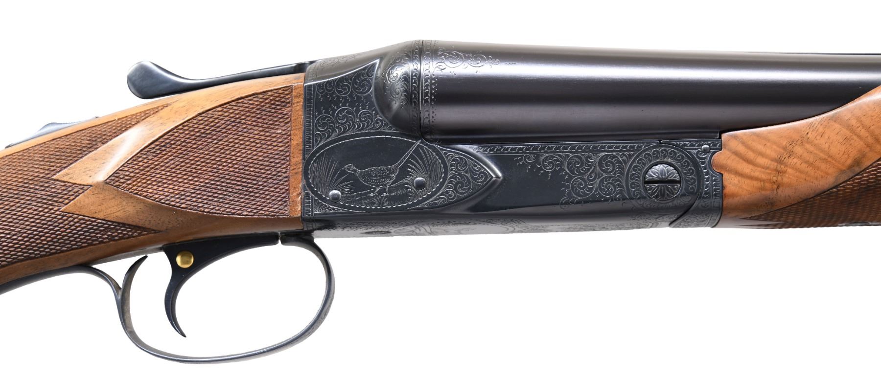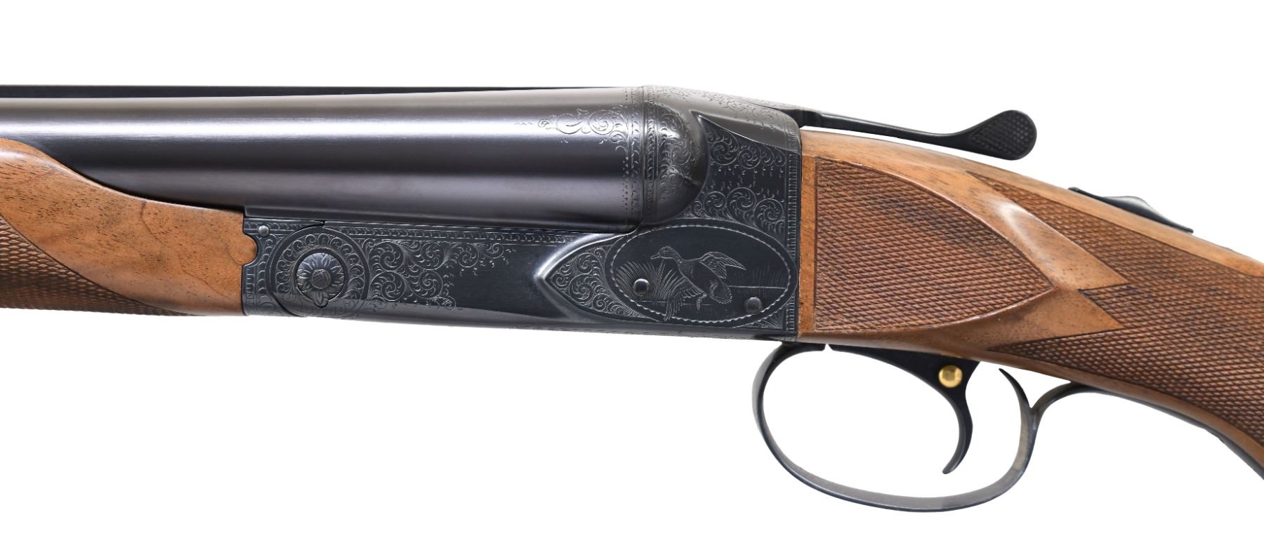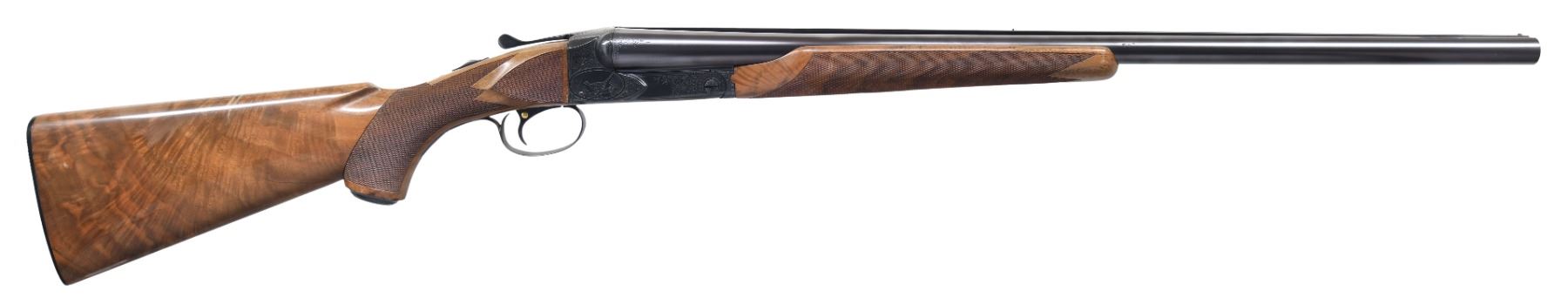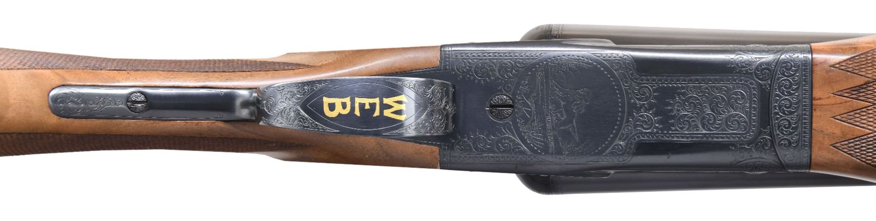 SXS SHOTGUN. Cal. 12 ga. 2 3/4". S# 17405. Bbls. 26". WS1 & WS2 chokes. Steel front & mid bead. Action has after market Winchester style five hand engraving. Engraving features vignettes of pheasants of right side, mallard on left w/ retriever on floorplate. Balance of receiver has scroll engraving w/ fancy borders that extend to breech end of bbls. Trigger guard has complimentary engraving w/ gold inlaid initials "WEB". SST. Selective ejectors. Factory style replacement beavertail forearm & pistol grip stock of fancy walnut w/ steel grip cap & gloss finish. Borderless point pattern hand checkering w/ extra checkering on stock ears. LOP: 14 1/4" over late style Winchester plastic buttplate. DAC: 1 9/16". DAH: 2 1/2". Neutral cast. WEIGHT: 7 lbs, 3.4 oz. CONDITION: fine as upgraded. Over 98% reblued finish. Stock & forearm have gloss refinish w/ cloudy spots along comb. Very good bright bores. (25-763/DS). CURIO. $3,000-5,000.