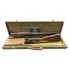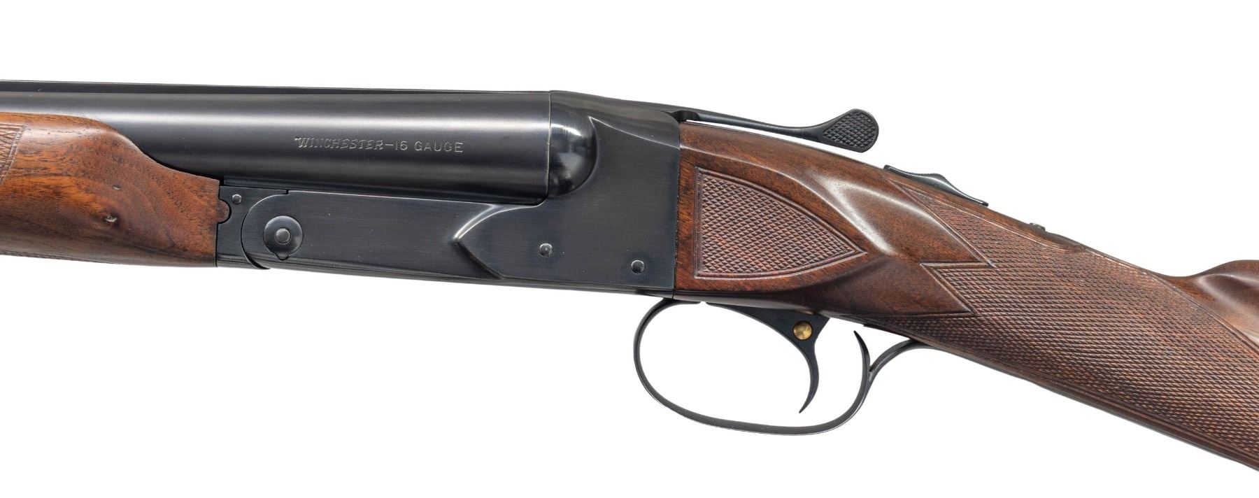 Cal. 16 ga. 2 3/4". S# 7068. Bbls. 26" with red target front sight and steel mid bead. Fixed "WS-1" and "WS-2" skeet chokes. Single selective trigger. Selective ejectors. Floorplate is marked "TRAP" above the screw and "SKEET" below it. Beavertail forearm with kidney pattern checkering and straight grip stock of fancy walnut with point pattern hand checkering with additional checkering on the stock ears. LOP: 13 5/8" to a checkered butt. WEIGHT: 6 lbs, 9 oz. UNATTACHED ACCESSORIES: green canvas covered Winchester marked case with leather trim for a Model 23 shotgun. Green fitted felt interior has an added black and gold Winchester Model 21 label. Case contains two keys. CONDITION: nicely restored gun. Action retains 99% reblued finish. Original barrel finish shows light wear at muzzle and breech ends. Refinished forearm shows two scrapes in the right side checkering with a large added wood repair chip at the tip. Refinished buttstock has freshened checkering. Tight sound action with top lever sitting right of center. Very good bright bores. PROVENANCE: Estate of Lloyd Robinson. (25-6661/DS). CURIO. $3,000-4,500.