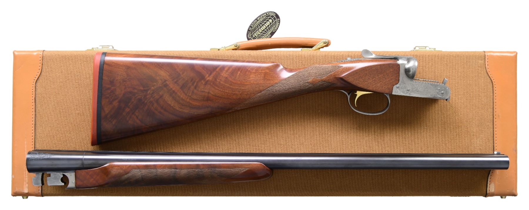 Cal. 12 ga. 2 3/4". S# GQ12-154E. Bbls. 25 1/2" w/ fixed Imp-Cyl & Imp-Mod chokes. White target front sight. Satin silver finished boxlock action. Right side scene depicts 2 flushing prairie chickens, Left side shows a setter & flushing quail. Floor plate features a gold plated quail portrait w/ marking "GOLDEN QUAIL". Balance of action has generous coverage of foliate scroll. Gold finished SST. Selective ejectors. Beavertail forearm & straight grip stock of satin finished fancy walnut w/ cut checkering. LOP: 14 1/8" over thin red Winchester pad. DAC: 1 1/2". DAH 2 1/2". Limited edition of 500 mfg. 1985. WEIGHT: 6 lbs, 11.6 oz. UNATTACHED ACCESSORIES: Winchester Golden Quail case containing keys. CONDITION: near excellent, retaining over 98% wood & metal finish. Bright near excellent bores. (25-761/DS). MODERN. $2,000-3,000.