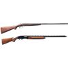 1) MODEL 24 SXS. Cal. 12 Ga., 2 3/4". S# 9522. Winchester proof 30" barrels have custom porting starting 3 1/4" from muzzle. Solid grooved rib has brass bead. Muzzles custom threaded for Briley thin choke tubes; 5 included. Boxlock action w/ extractors & dbl. triggers. Walnut stock set. LOP: 14.25" to replacement Win. red pad. CONDITION: fair barrel blue mixing with brown patina showing spots of corrosion, clean pitting & marks. Gray/brown patina appearance on receiver showing silvering & cleaned pitting. Fair worn wood finish with numerous dings & scattered cracks. Fair bores with sm. dents. (25-4472/MD). 2) MODEL 1500 XTR SEMI-AUTOMATIC. Cal. 12 GA, 2 3/4". S# NX026121. Bbl. 28". Model 1500 XTR semi-automatic shotgun mfg. by Winchester. Left side of the bbl. exhibits standard factory markings denoting Winchester's mfg. information, as well as the model and cal. designations above "WINCHOKE". Left side of the receiver is marked "MODEL 1500 XTR" above the S#. Alloy receiver exhibits an anodized blue finish, with the alloy trigger group exhibiting a black enamel type finish. Steel bbl. exhibits a blue finish. Bolt is jeweled in-the-white. Checkered wood forearm and blued steel capped pistol grip buttstock with checkered black synthetic Winchester buttplate. Bbl. features a grooved matte V/R, aluminum bead front sight, and threaded choke, currently fitted with a Carlson's Modified choke. CONDITION: metal components retain the majority of their original factory finishes, exhibiting scattered superficial handling marks and some small spots of wear. Bolt shows spots of light oxidation and age related discoloration. Mirror bore. Proper manual mechanics. Wood furniture shows scattered superficial marks and scratches, but otherwise remains sound. (25-4523/MLW). ALL MODERN. $550-850.