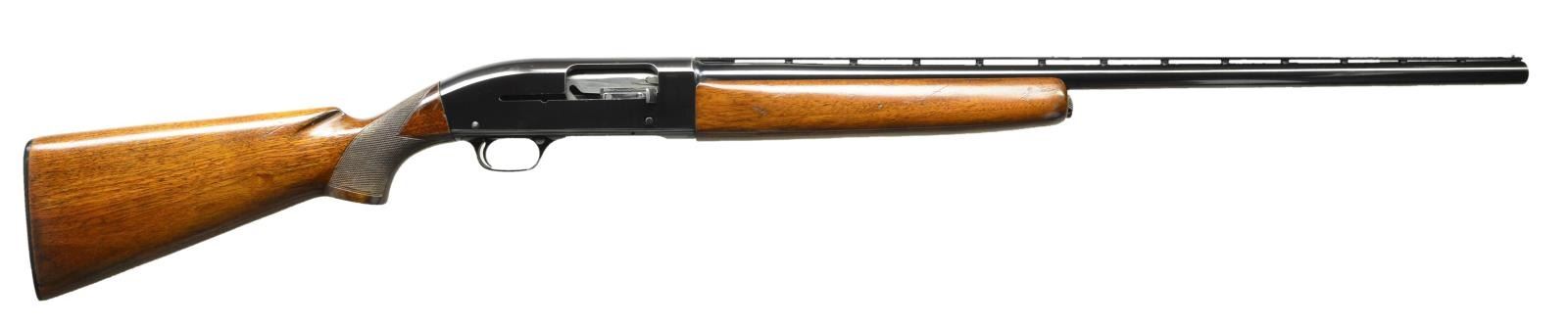 Cal. 12 Ga., 2 3/4". S# 65703 (1956). Bbl. 28" VR w/ bright beads & Full choke. Blue finish. Steel receiver. Walnut forearm & checkered pistol grip stock. LOP: 14 1/4" to Win. buttplate. CONDITION: near excellent bbl. blue w/ the occasional mark. Very good receiver blue showing edge wear, cycling wear, & scratches. Sanded & refinished wood has handling marks & dents throughout; a few gouges pierce the finish. Forearm has large crack on bottom. Toe has 2" piece of replacement wood. Very good shiny bore w/ fouling. (23-16/MD). CURIO. $400-600.