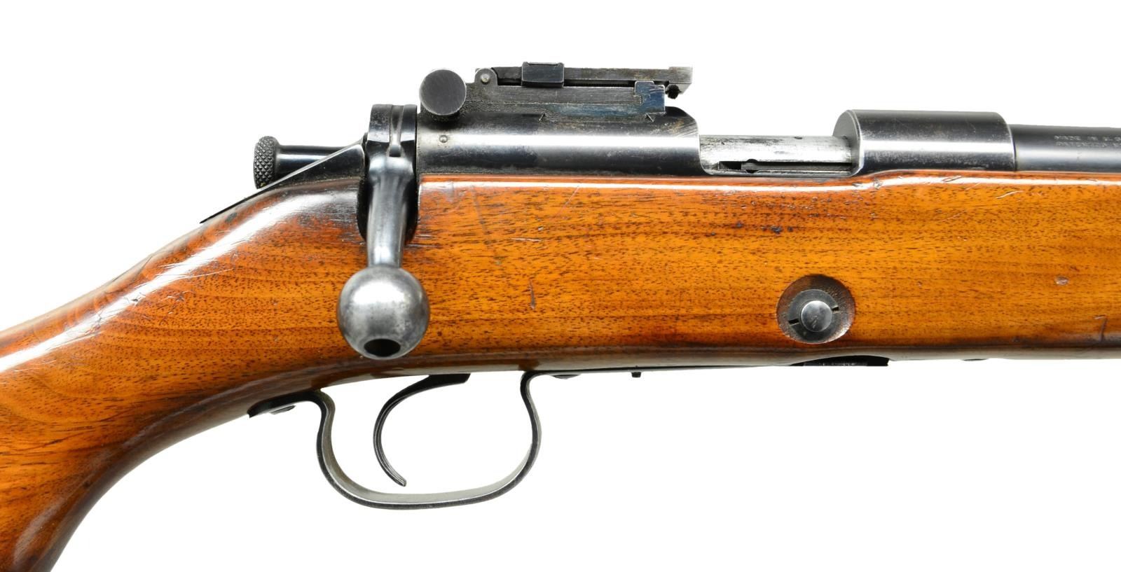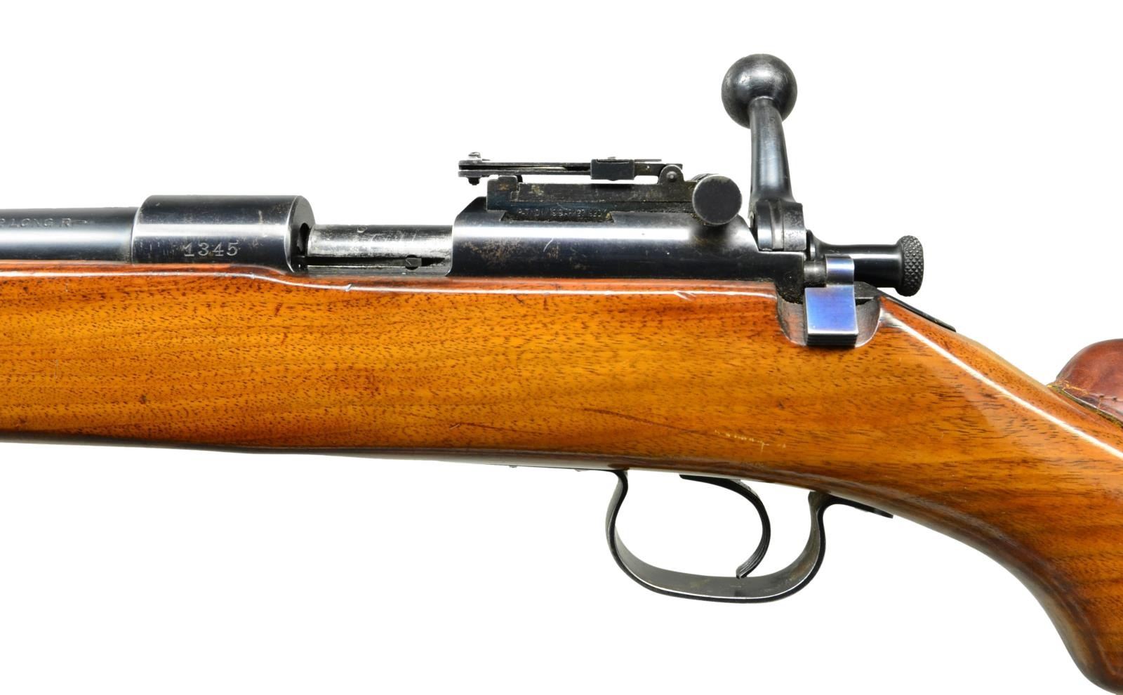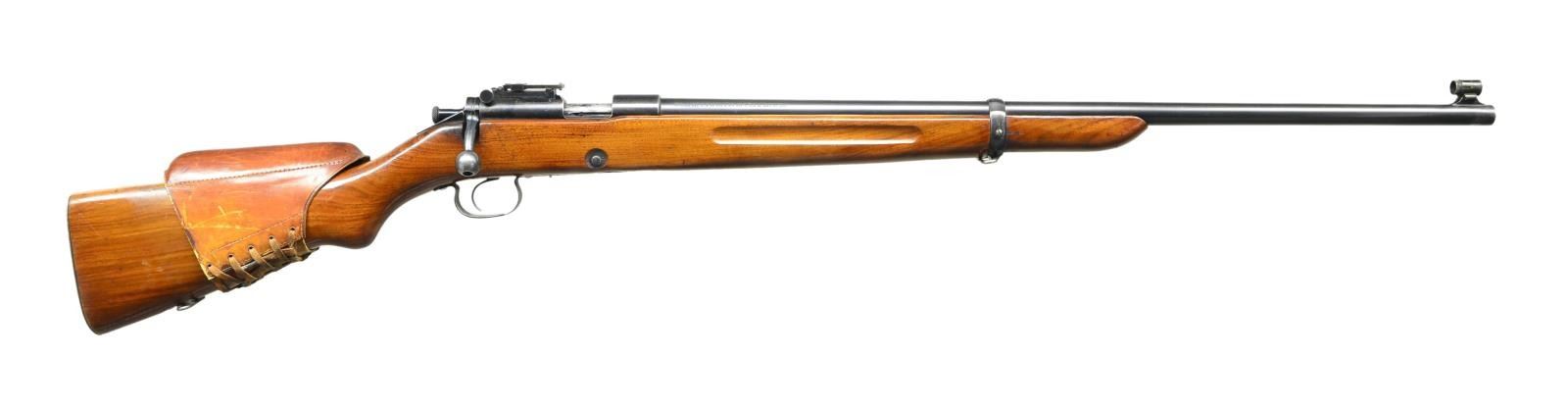 Cal. 22 LR. S# 1345. Bbl. 28". Early 1920 mfg. rifle w/ Lyman hooded front sight w/ round aperture & folding ladder 82A adjustable rear sight. Top of Bbl. has 4 drilled & tapped holes. Blued finish, single barrel band secures one piece finger groove, semi pistol grip stock. Serrated metal buttplate & sling swivels. MAGS: 1-5 rd. UNATTACHED ACCESSORIES: “ROWLEY PAD” leather laced cheek rest. CONDITION: metal retains about 85% coverage w/ trigger guard & buttplate showing the most wear & light rust. Stock has been revarnished over original dings, dents, gouges & deep scratches. Bore is very good, bright & strongly rifled. (23-122/CW). CURIO. $600-900.