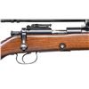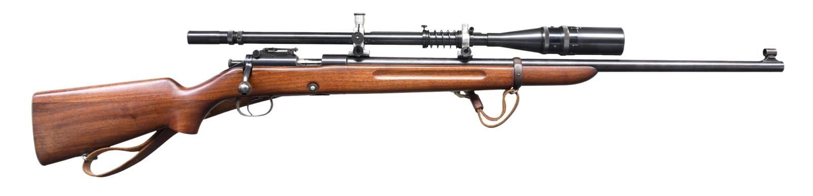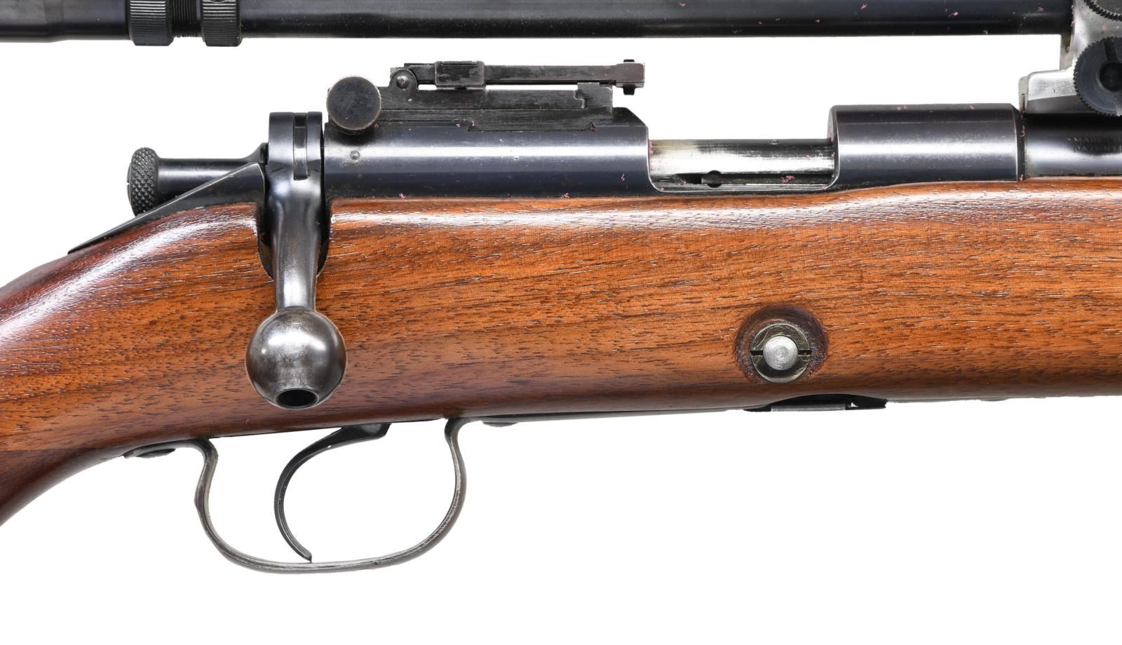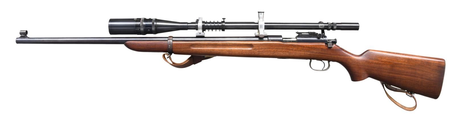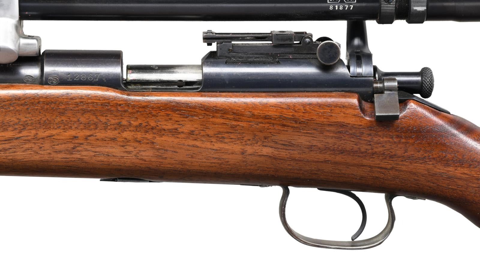 RIFLE. Cal. 22 LR. S# 12867. Bbl. 28" standard weight. Hooded ramp front sight w/ graduated leaf receiver sight. Slow lock action. Unertl 20 power target scope no. 81877 mounted on bbl. blocks. Finger groove walnut stock w/ checkered steel buttplate & leather sling on original swivels. Lower portion of the stock, from the rear of the trigger guard to the buttplate, has been spliced & replaced to provide a faller pistol grip for shooter preference. MAGS: 1 detachable 5-rd w/ proper markings. CONDITION: 80% original blue w/ carry wear on floorplate. Bore retains worn rifling. Stock has a good refinish. Scope has clear optics. (23-6007/DS). CURIO. $900-1,500.