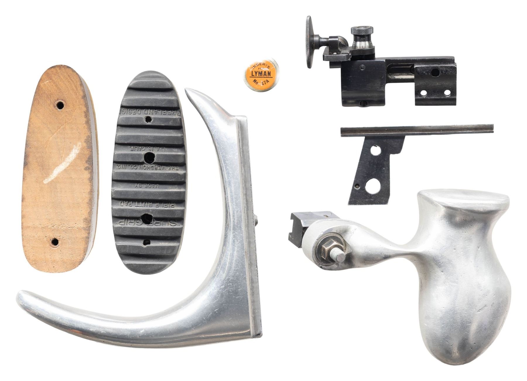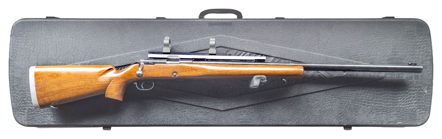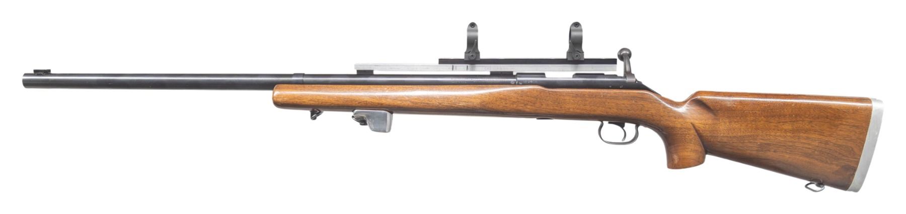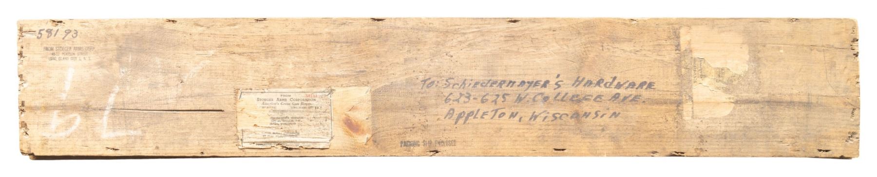 ORIGINAL STOEGER SHIPPING CRATE, HANG TAG, & 1955 DATED RECEIPT. Cal. 22 LR. S# 82740C. Bbl. 28". Model 52C bolt action target rifle mfg. by Winchester in 1956. Left side of the bbl. exhibits standard factory markings denoting the model and cal. designations. Left side of the receiver is marked with the S#, followed by a "C" suffix, with the Winchester trademark logo marked on the right. Underside of trigger guard is marked "O.T." and "PULL". Metal components exhibit a blue finish overall, save for on the bolt body. which is polished in-the-white. 1-piece plain wood pistol grip stock features a steel hand stop rail on the underside of the forearm, currently fitted with a left handed aluminum hand stop. Buttstock has been shortened and fitted with an aluminum buttplate rail with removable buttplates. Toeline of stock features an inletted sling swivel, with an additional swivel fitted on the hand stop rail. Bbl. features 3 dovetail mounts for iron sight and scope attachments, the rearmost 2 mounts currently fitted with a custom scope rail, featuring 2 Warren lever scope rings. UNATTACHED ACCESSORIES: generic hard case containing a Schuetzen style aluminum buttplate, an aluminum and grooved black rubber Mershon Co. Sure Grip buttplate, an aluminum palm rest marked "WP/ 3 29 58" on the left side with Canjar dovetail rail mount, a Lyman No. 77H globe front sight, a Lyman No. 525 large disc adj. aperture rear sight, as well as the cut section of wood from the butt. Rifle is also accompanied by an original wooden shipping box from Stoeger Arms Corp, exhibiting handwritten text in black ink on the lid that indicates shipment to Schiedermayer's Hardware Company in Appleton, WI. Additionally, this example is accompanied by original paperwork consisting of the matching factory box end label, original factory hang tag (detailing the trigger assembly), as well as 2 "1955" dated receipts from Schiedermayer Hardware Company, one listing this rifle by S#. CONDITION: excellent, with metal components retaining bountiful amounts of their original factory blue finish, exhibiting some light superficial scratches and handling marks overall. Bolt knob shows some light wear and thinning that is fading to gray patina. Mirror bore, retaining well defined rifling throughout. Proper manual mechanics. Stock shows scattered superficial marks and small impressions from handling and storage, with some scattered spots/areas of a darker added varnish. Crate exhibits general overall age related wear, as well as scattered marks from handling and storage, but otherwise appears to remain sound. PROVENANCE: From the Buckstix Collection. (25-6504/MLW). CURIO. $1,750-2,500.