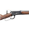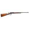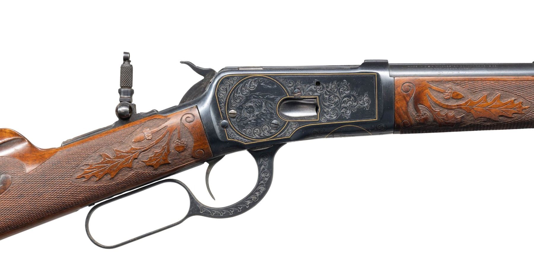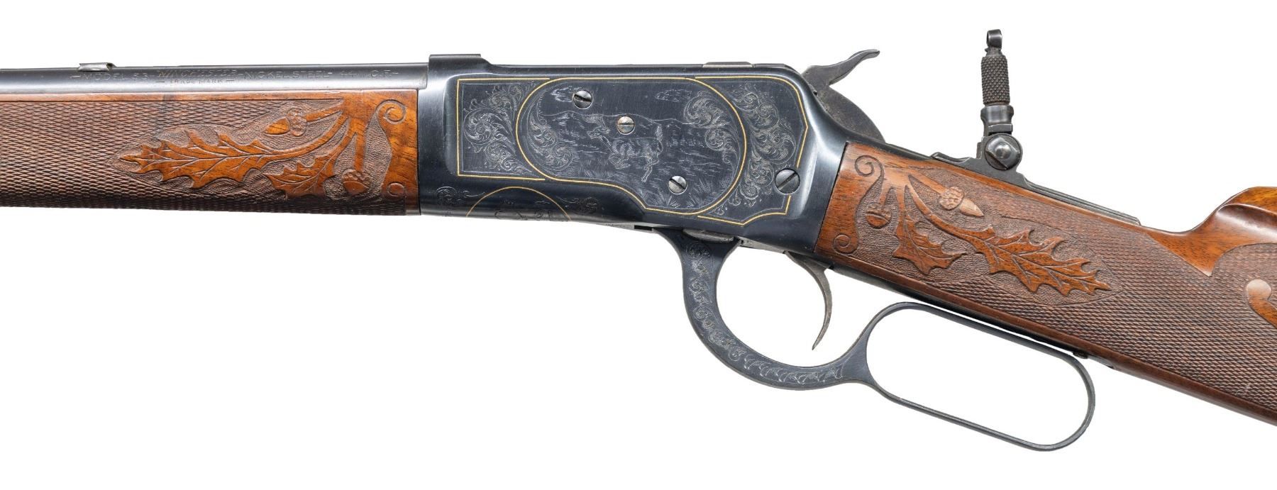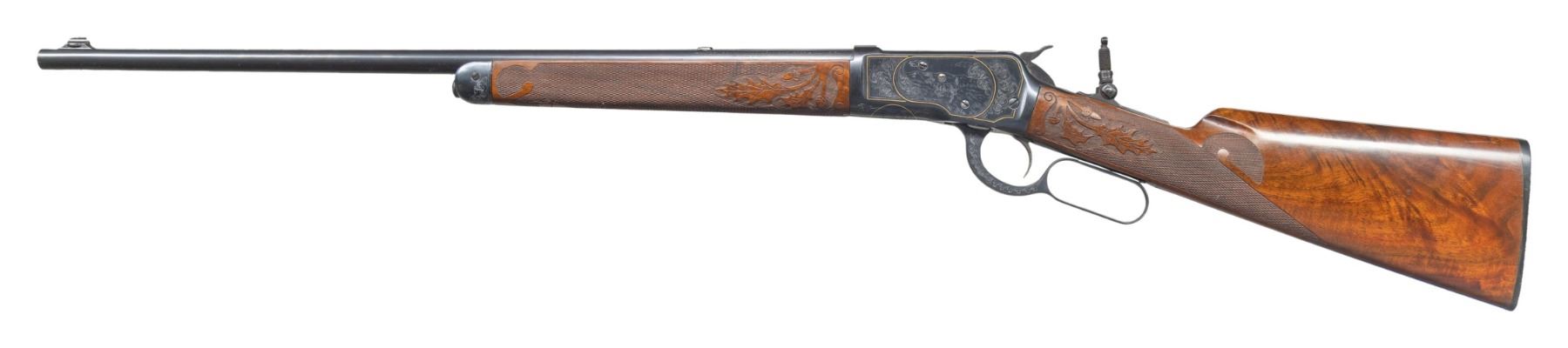 RIFLE. Cal. 44 WCF. S#. 6254. Bbl. 22" tapered round. Brass bead front, filler in rear dovetail with combination tang sight. Button mag. The action has fine custom unsigned hand engraving similar to style 6 with gold borders, Game scenes feature a wild boar on the right side, running whitetail buck on the left with a bear on the bottom. Custom forend and straight grip stock of nicely grained walnut. Fancy borderless hand checkering has oak leaf highlights against stippled backgrounds. LOP. is 13 1/4" to a Winchester plastic buttplate. mfg. 1926. CONDITION: metal retains over 95% reblued finish showing spots of freckling on the bbl. wood has good finish with handling marks and mildew spots. the stock has small chips around the top tang. Sound action. Very good bright bore shows a few small spots of very light pitting. (25-1299/DS). CURIO. $3,000-5,000.