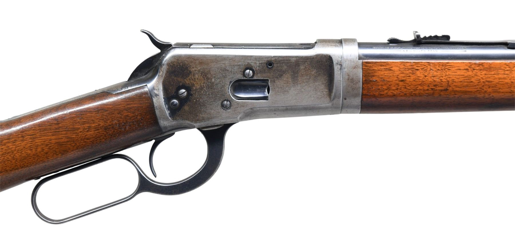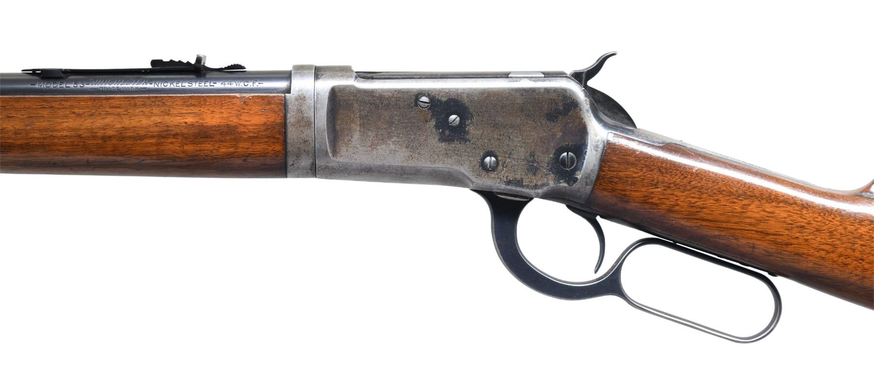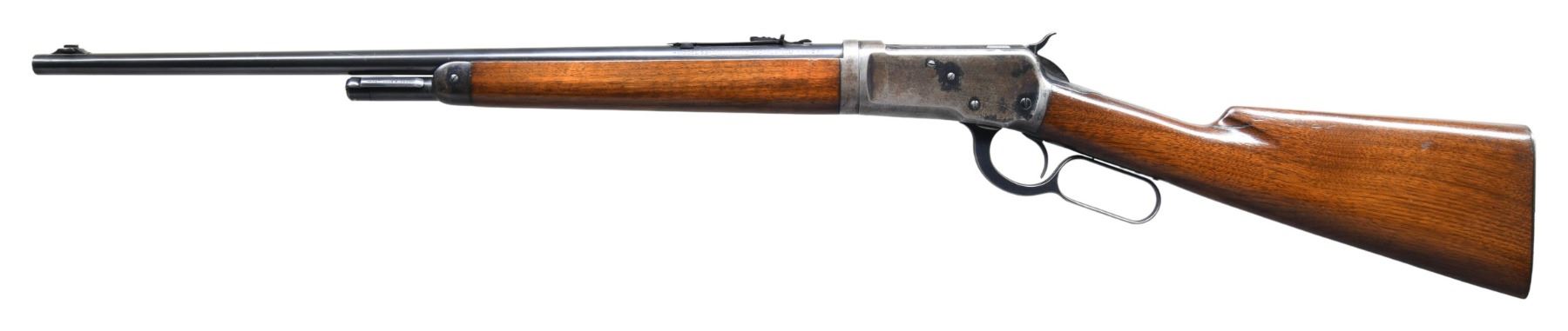 Cal. 44 WCF (44-40). S# 3334. Bbl. 22" tapered rnd. Ramp mounted Lyman bead front sight with original flat top sporting rear sight. Half length takedown mag. Blue finish. Walnut forearm and straight grip stock with flat grooved steel buttplate. Mfg. in 1925, second year of production. CONDITION: bbl. retains 90% original blue showing slight muzzle wear with scattered light scratches. Action has largely flaked to gray/brown showing small amounts of original blue on protected areas of the receiver and lever. Original wood finish shows light wear with scattered scratches and marks. Bore is bright with sound rifling showing scattered light pitting. (25-1756/DS). CURIO. $3,000-4,000.