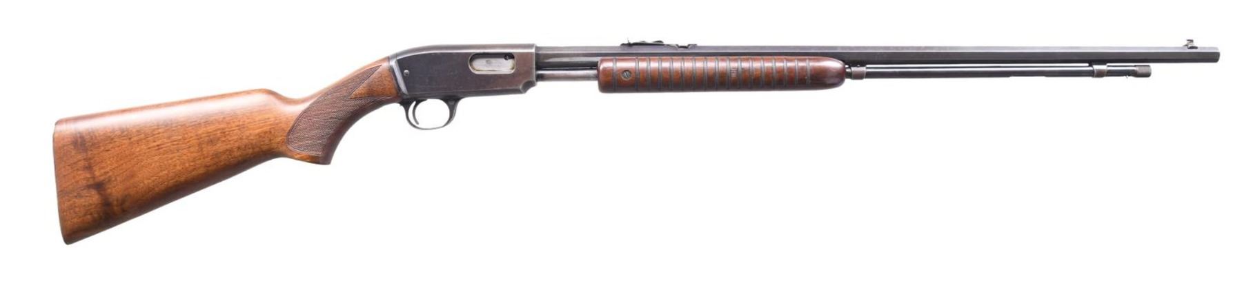 Cal. 22 WRF. S# 38945. Bbl. 24" octagon w/ bead front sight & sporting rear sight. Tubular mag. Flat bottom groove forearm. Pistol grip walnut stock w/ checkered steel buttplate has added checkering at wrist. Mfg. 1939. CONDITION: 70% dull fading blue showing scattered freckling. Forearm has slightly worn original finish w/ handling marks. Sanded & refinished stock w/ a few small marks. Added checkering is sharp. Very good bright bore. (24-942/DS). CURIO. $2,000-3,000.