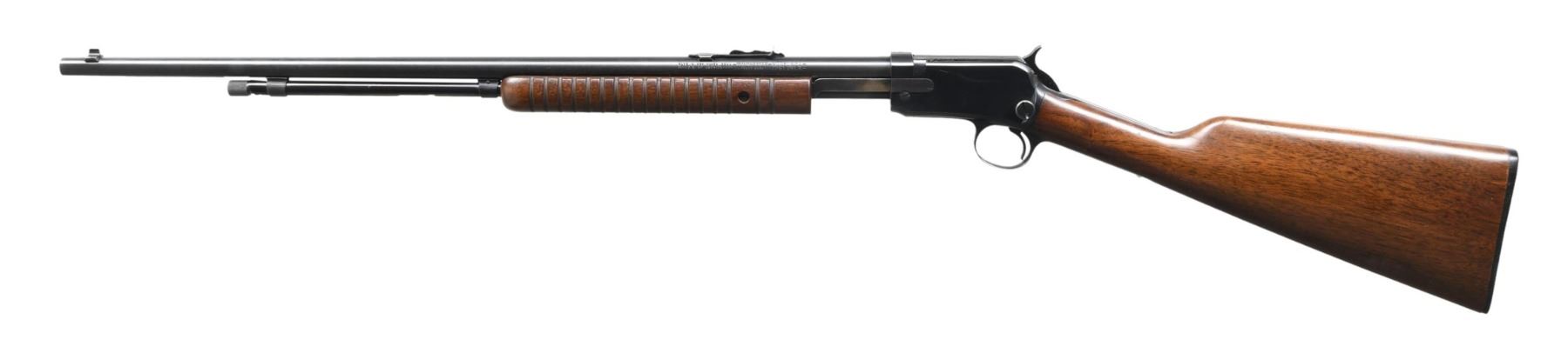 Cal. 22 S,L,LR. S# 362229. Bbl. 23" round w/ sporting sights. Tubular mag. Blue finish. Flat bottom grooved forend & straight grip walnut stock w/ plastic buttplate. Mfg 1957. CONDITION: over 97% blue showing slide wear. Stock finish shows a few light scratches. Very good bright bore. (24-5550/DS). $700-1000.