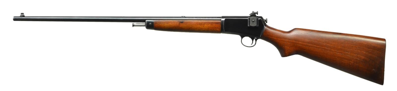 Cal. 22 LR. S# 115532A . Bbl. 23" with dovetails having Lyman white bead front sight and Lyman 12S slot blank at rear; Lyman 66 MB steel vintage receiver sight with Williams WGRS aperture. Mfg. 1952 (1933-1958) as improved variation of model 1903 chambered for then new 22 LR cartridge. 10 Rd. tubular magazine in buttstock that loads through elliptical cutout on right side. Smooth walnut stock set and checkered steel buttplate. CONDITION: very good to excellent overall appearance with light thinning on high edges of action and buttplate. Small light scratches; lower left of barrel in front of forend cap and by left side of safety. Stock set about near excellent with original finish having beginning hairline crack on bottom of forend near receiver. Near excellent bore. (22-5979/NW). CURIO. $500-750.
