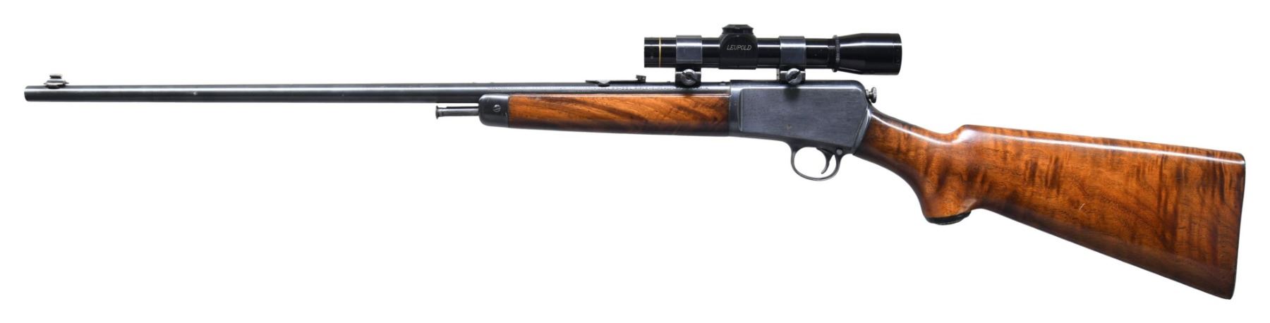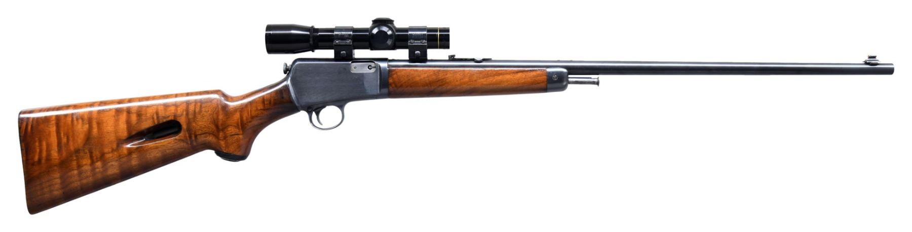 Cal. 22 LR. S# 49236. Bbl. 23". Model 63 semi-automatic rifle mfg. by Winchester in 1942. The left side of the bbl. exhibits standard markings denoting Winchester's mfg. information, as well as the model and cal. designations. Metal components exhibit a reapplied blue finish blue finish overall, save for on the bolt, which is polished in-the-white. High grade plain wood pistol grip buttstock and forend, with smooth steel buttplate and Winchester black hard rubber pistol grip. Wood furniture has been sanded and revarnished at one time. Dovetailed Marble natural white beaded blade front sight, with dovetailed Marbles flip-up U-notch rear sight. Bbl. and receiver tang have been drilled and tapped. Receiver and bbl. are fitted with a Weaver M8 2.5x Compact scope. Matching numbers are present on the upper and lower assemblies. CONDITION: metal components retain the majority of their reapplied blue finish, exhibiting some spots of light to mild wear, as well as scattered spots of oxidation and light pitting, which are primarily present on the receiver. S#s on upper and lower assembles show softening, but otherwise remain legible. Mirror bore, exhibiting well defined rifling throughout. Wood furniture is good, as refinished, exhibiting some scattered superficial marks from handling and storage, with a crack present on the right side of the wrist, stemming from the receiver. Scope retains a clear and sharp optic. (25-2065/MLW). CURIO. $700-1,000.