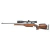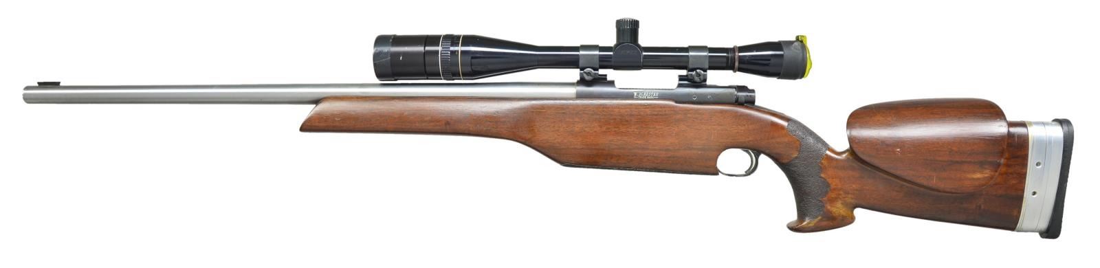 Cal. 223 Rem. S# G2121629. Bbl. 26" stainless w/ recessed crown & target block at front; .88" at muzzle & 1.15" at receiver. Army Marksmanship Unit style custom repeating rifle w/ special glass bedded stock (full floating bbl.) designed for off hand match shooting. Pronounced rollover cheekpiece, aluminum buttplate w/ multiple adjustments having Pachmayr basket weave pad, stippled grip area w/ palm swell/support, action section very deep & even w/ trigger guard having stick on non slip textured surface. Right side of buttstock has US Army marksmanship decal. Left side of stock relieved for target sight. Action mfg. post 1992 w/ push feed jeweled bolt w/ matching number & epoxy like surround on bolt handle to increase its size. Unmarked target trigger w/ less than 1 lb. trigger pull. Weaver mt. set w/ Leupold 24X target scope having sunshade & capped target turrets. CONDITION: good to very good overall appearance w/ numerous light marks throughout. Slight witness mark in rear target sight area. Rub marks & light scratches on scope set w/ light loss at high points; near excellent optics. Bolt noticeably smooth w/ locking lugs appearing lapped. Very functional bolt handle addition but not aesthetically pleasing. Near excellent bore. (21-4571/NW). MODERN. $800-1,200.