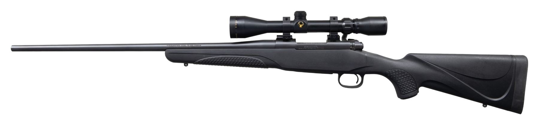 Cal. 223 WSSM. S# G3038978. Bbl. 22". Rifle is sighted with a Simmons 3-9x power scope. Scope has duplex crosshair reticle & very good optics. Winchester Model 70 CRFP NS rifle. Matte blue finish. Black synthetic pistol grip stock with bottom mounted sling studs & black recoil pad. LOP: 13 1/4". UNATTACHED ACCESSORIES: matching numbered factory box with manual. CONDITION: all aspects near excellent with factory hang tags on trigger guard. (24-3300/MJC). MODERN. $400-600.