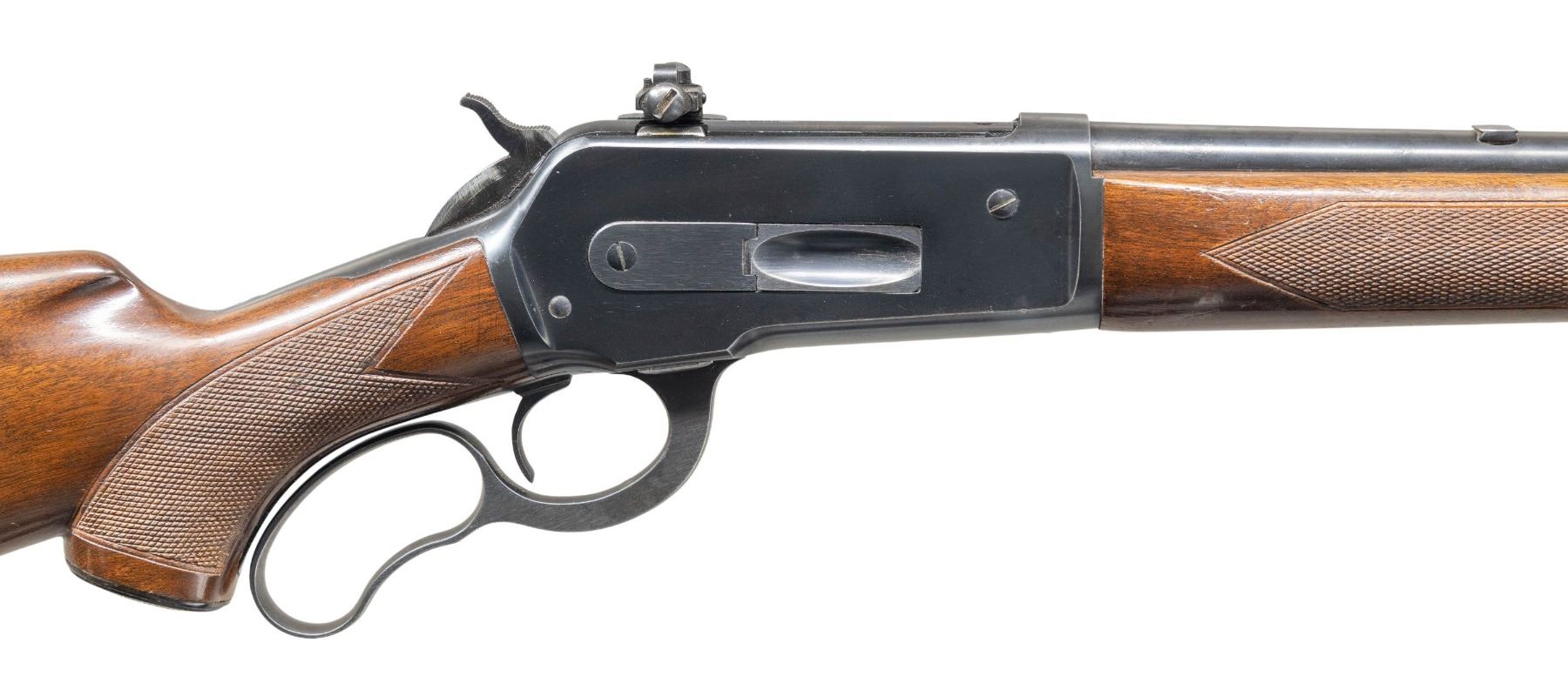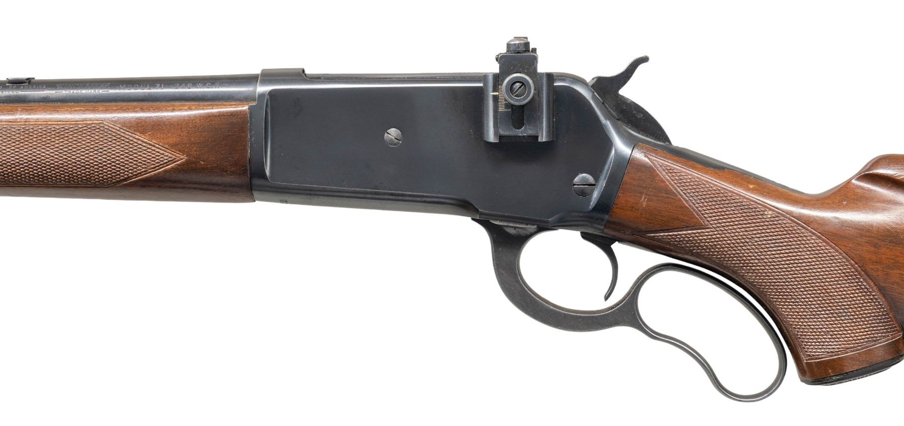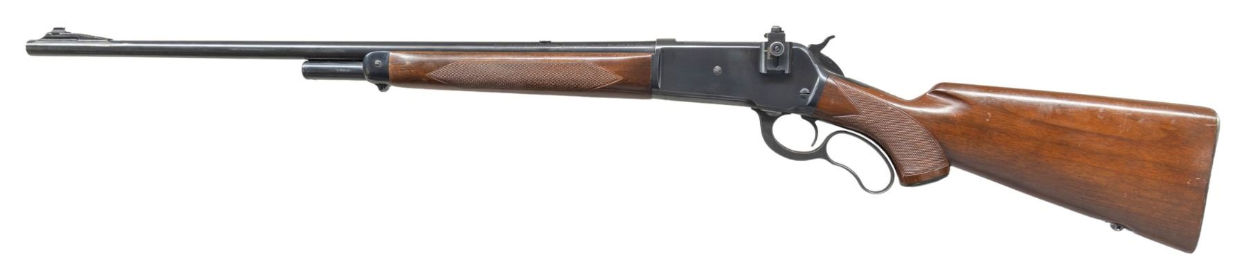 Cal. 348 WCF. S# 41421. Bbl. 24". Model 71 lever action rifle mfg. by Winchester in 1955. Left side of the bbl. exhibits standard markings denoting Winchester's mfg. information, as well as the model and cal. designations. Metal components exhibit a blue finish overall. Checkered wood semi-beavertail forearm and black synthetic capped pistol grip stock with flat checkered steel buttplate. Ramped aluminum beaded blade front sight with slot blank in rear dovetail and Lyman No. 56 peep sight mounted on left side of receiver. Lyman sight is missing its disc aperture. Underside of stock and forearm cap feature factory Super Grade sling swivel bases. CONDITION: metal components retain the majority of their original factory blue finish, showing some areas of mild wear and thinning fading to gray patina, with some scattered scratches, superficial handling marks, and small spots of light surface oxidation present overall. Very bright bore, exhibiting some light pitting, while retaining well defined rifling throughout. Proper manual mechanics. Wood furniture shows some wear to its varnish finish, as well as scattered superficial marks and impressions from handling and storage, but otherwise remains sound. PROVENANCE: Estate Collection of John "Jack" Dhooghe. (25-5506/MLW). CURIO. $1,500-2,250.