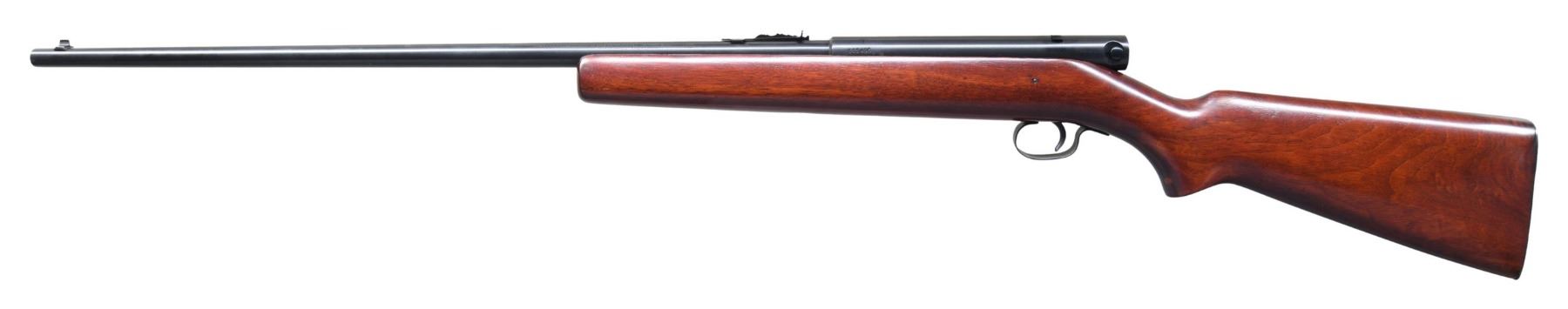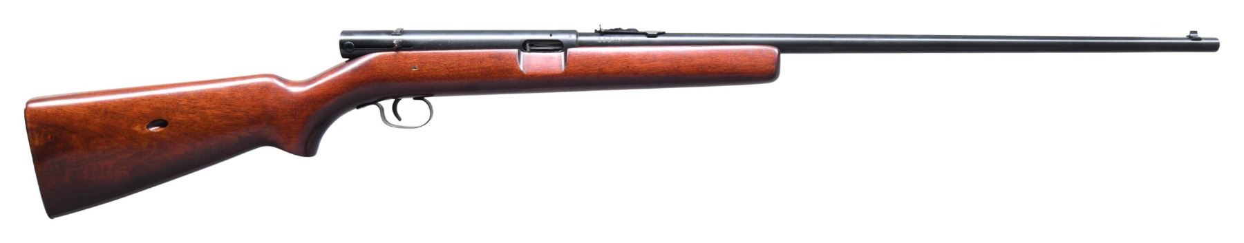 Cal. 22 Short. S# 111496. Bbl. 24" rnd. with original sporting sights. Left side of bbl. have British proofs with marking "NOT ENGLISH MAKE". Walnut pistol grip stock. Mag. tube inserts through impressed checkered steel buttplate and loads on the right side. CONDITION: metal retains nearly all reblued finish. Refinished stock shows a few small marks. Very good bright bore. (25-2512/DS). CURIO. $250-350.