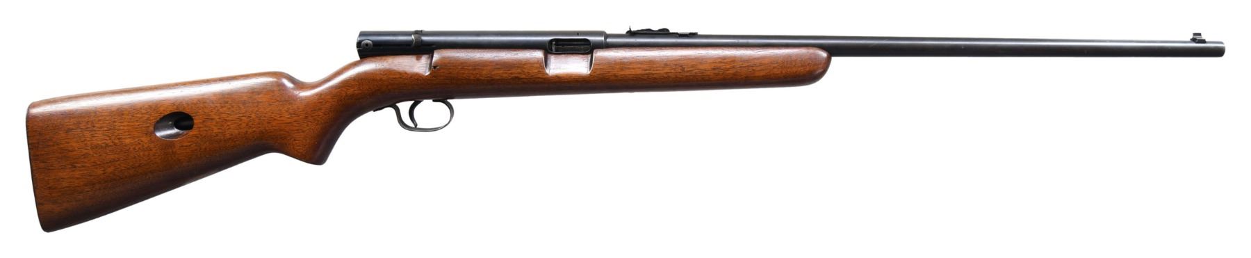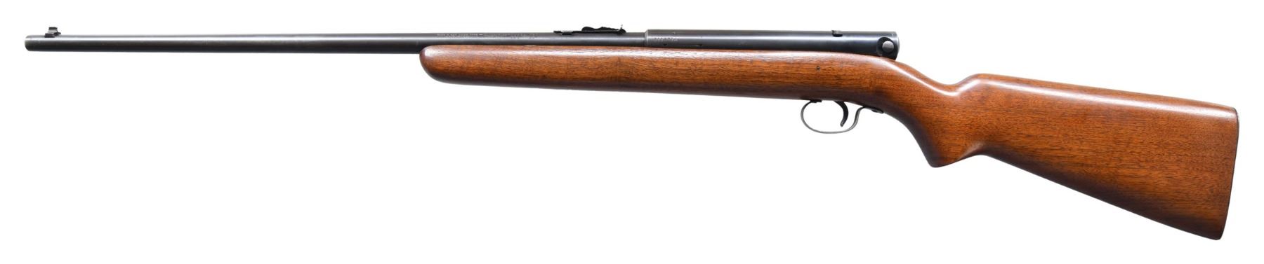 Cal. 22 S, L, LR. S# 311861A. Mfg. 1952. Bbl. 22" w/ sporting sights. Blue finish. Walnut pistol grip buttstock with checkered metal buttplate & tubular mag. CONDITION: Fair fading original blue mixed with brown patina. Very good original wood finish with light handling marks, light fading of finish on bottom surfaces of toeline & grip along with light mildew stains. Very good shiny bore with strong rifling. (25-1777/MD). CURIO. $300-400.