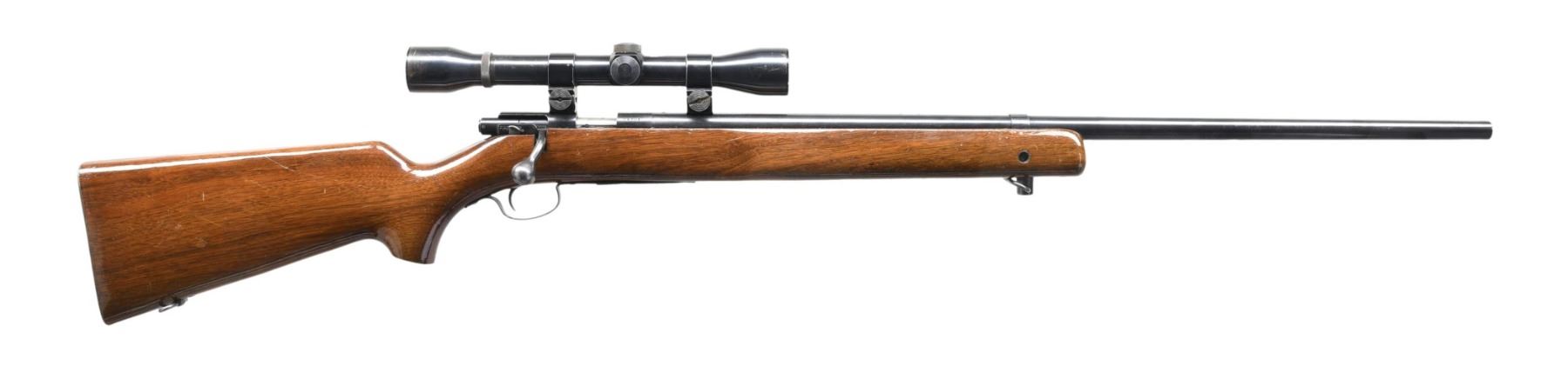 Cal. 22 LR. S# 81301. Bbl. 28 1/4". Model 75 bolt action target rifle, mfg. by Winchester in 1952. Left side of the bbl. exhibits markings stipulating Winchester's mfg. information, as well as the model and cal. designations, followed by the Winchester trademark logo. Left side of the receiver is marked with the Winchester trademark logo, with the S# marked on the right side of the chamber. Metal components exhibit a blue finish overall. Plain wood pistol grip buttstock with flat checkered steel buttplate. Receiver is mounted with a Weaver Marksman 4x scope. Front and rear iron sights are absent. Front sight base screws are absent. Mag. has been replaced with a solid block of metal, making the rifle a single shot. CONDITION: metal components retain the majority of their original factory blue finish, exhibiting some light to mild wear (primarily on the bolt knob and handle), with some scattered superficial handling marks, as well as scattered spots of light surface oxidation overall. Mirror bore, exhibiting well-defined rifling throughout. Stock exhibits scattered marks and minor impressions from handling and storage, as well as scattered spots of flaking to the varnish, but otherwise remains sturdy and serviceable. Exterior of scope shows some wear, scattered handling marks, and oxidation, with the scope retaining a clear optic. (24-5748/MLW). CURIO. $850-1,000.