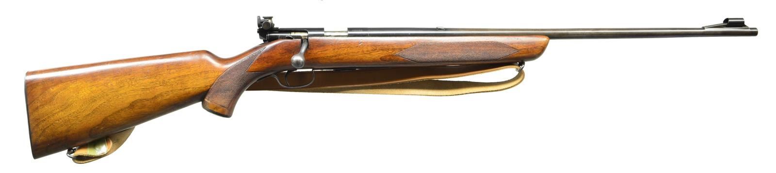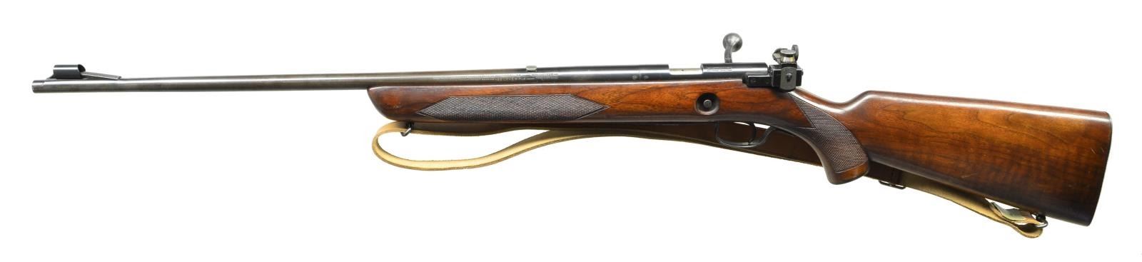 Cal. 22 LR. S# 65952. Bbl. 23 1/2" tapered rnd. sporter weight. Hooded ramp bead front sight, filler in rear dovetail w/ a Lyman 57ES receiver sight. Smooth top receiver. Walnut sporter stock w/ hand checkering, hard rubber grip cap & grooved steel buttplate. Modern leather sling on original swivels. MAGS: 2 total. 1 - 5 Rd. original & 1 5 rd. replacement. CONDITION: action retains over 95% blue. Forward section of bbl. is fading to gray. Original wood finish shows scattered scratches & marks. Bright bore w/ sharp rifling. PROVENANCE: from the estate collections of Charles P. Obremski. (22-1320/DS). CURIO. $800-1,200.