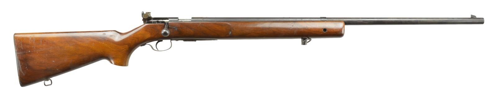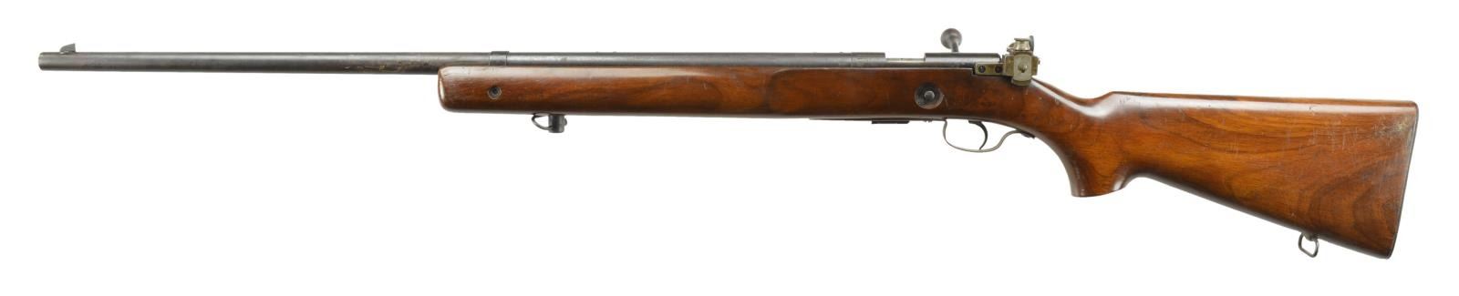Cal. 22 LR. S# 25913. Bbl. 28" heavy weight. Blade front sight w/ Lyman 57E receiver sight. Walnut target stock w/ accessory rail, sling swivels & checkered steel buttplate. MAGS: 1-5rd. factory detachable mag. CONDITION: 50% dull blue fading to brown showing scattered corrosion & light pitting. Buttplate shows red rust & pitting. Stock has worn finish w/ dents & handling marks having crack along right side of action. Very good, bright bore. PROVENANCE: From the Collection of Thomas B. Harper Jr. (22-1027/DS). CURIO. $300-400.