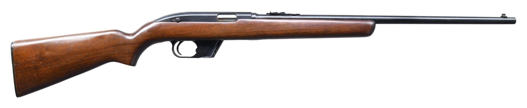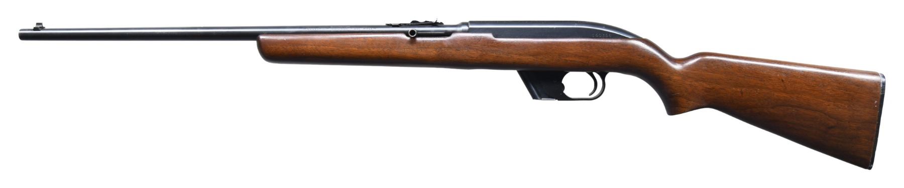 Cal. 22 LR. S# 150356. Bbl. 22". Model 77 mag. fed semi-automatic rifle mfg. by Winchester between 1955-1963. Left side of the bbl. is marked with the model designation, followed by the Winchester trademark logo, as well as the cal. designation. Left side of the receiver is marked with the S#. Metal components exhibit a blue finish overall, save for on the bolt, which is polished in-the-white. 1-piece plain wood pistol grip buttstock, with black synthetic trigger guard and Winchester checkered black synthetic buttplate. Dovetailed blade front sight, with dovetailed U-notch rear sight. MAGS: 1 7-rd. CONDITION: metal components retain the vast majority of their original factory blue finish, exhibiting some scattered superficial handling marks, with scattered spots of light to mild surface oxidation present on the underside of the bbl. Mirror bore, exhibiting well defined rifling throughout. Stock shows scattered marks and some minor impressions from handling and storage, but otherwise remains sturdy and serviceable. (25-1772/MLW). CURIO. $300-400.