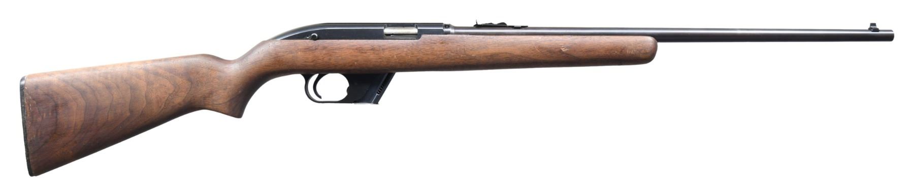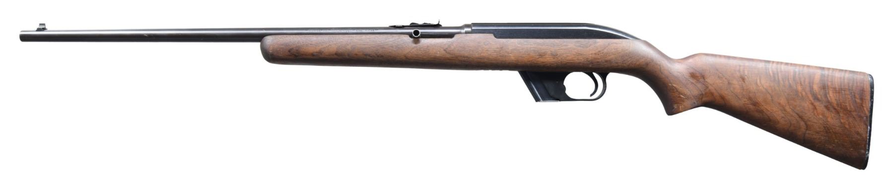 Cal. 22 LR. NSN. Bbl. 22" rnd. with original sporting sights. Breech end of bbl. has loaded chamber indicator. Walnut stock with plastic buttplate. Plastic trigger guard partially encloses the mag. Mfg. 1955-1962. MAGS: 1 detachable 10-rd. CONDITION: over 80% blue showing small wear spots, handling marks, and spotted freckling. Sanded stock has dull worn appearance showing scratches and marks. Very good bright bore. (25-3703/DS). CURIO. $200-300.