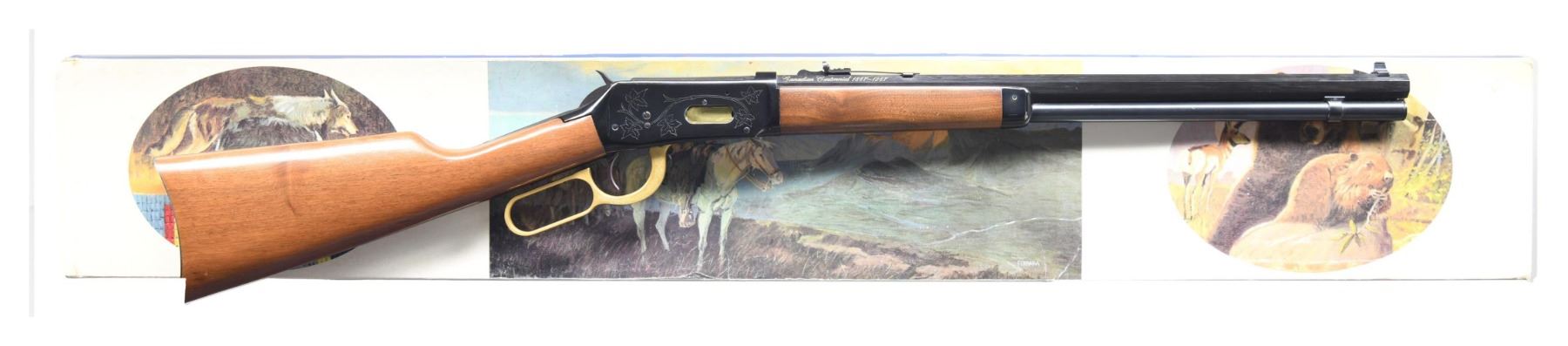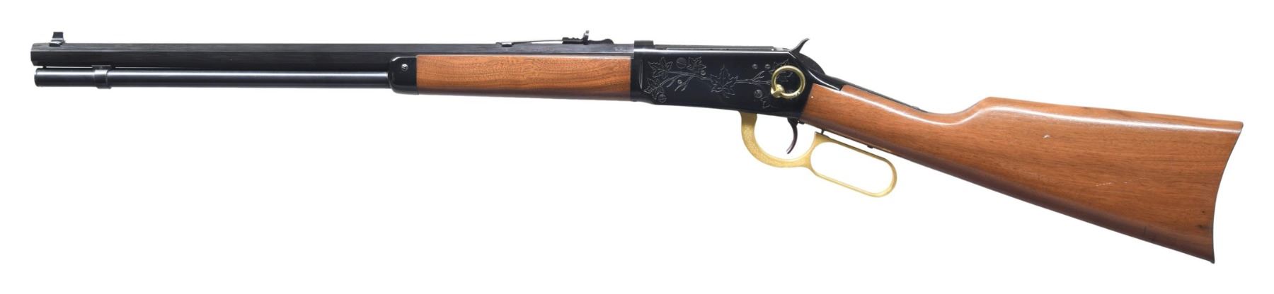 ACTION RIFLE WITH STYROFOAM INSERT & SLEEVE. Cal. 30-30. S# 68389. Bbl. 20". Model 94 lever action rifle mfg. by Winchester commemorating Canada's 1967 centennial. The left quarter flat of the octagonal bbl. is marked with the Winchester trademark logo, followed by the cal. designation, with "Canadian Centennial 1867-1967" marked on the right quarter flat. Sides of the receiver exhibit engraved branches and maple leaves, with "CANADIAN CENTENNIAL '67" marked on the upper receiver tang. Sides of lever exhibit oak leaf engraving. Receiver and forend cap exhibit a dark polished blue finish, with the bbl., mag. tube, hammer, and trigger exhibiting a standard blue finish. Lever and loading gate exhibit a gold plated finish. Plain wood straight grip buttstock and forend have been sanded and revarnished at one time. Buttplate has been polished and reblued. Dovetailed aluminum beaded blade front sight, with dovetailed U-notch rear sight. UNATTACHED ACCESSORIES: Winchester Legendary Frontiersmen styrofoam insert and cardboard sleeve. CONDITION: metal components retain bountiful amounts of their original factory finishes, exhibiting some scattered superficial handling marks overall. Buttplate retains the majority of its reapplied blue, exhibiting some wear and a few spots of pitting beneath the finish. Mirror bore, exhibiting some scattered spots of light surface oxidation, while retaining well defined rifling throughout. Wood furniture shows some scattered marks and impressions from handling and storage, but otherwise remains sturdy and serviceable. Cardboard sleeve shows some wear, staining, and tearing along the edges, but otherwise remains sturdy and serviceable. (25-1651/MLW). CURIO. $700-1,000.