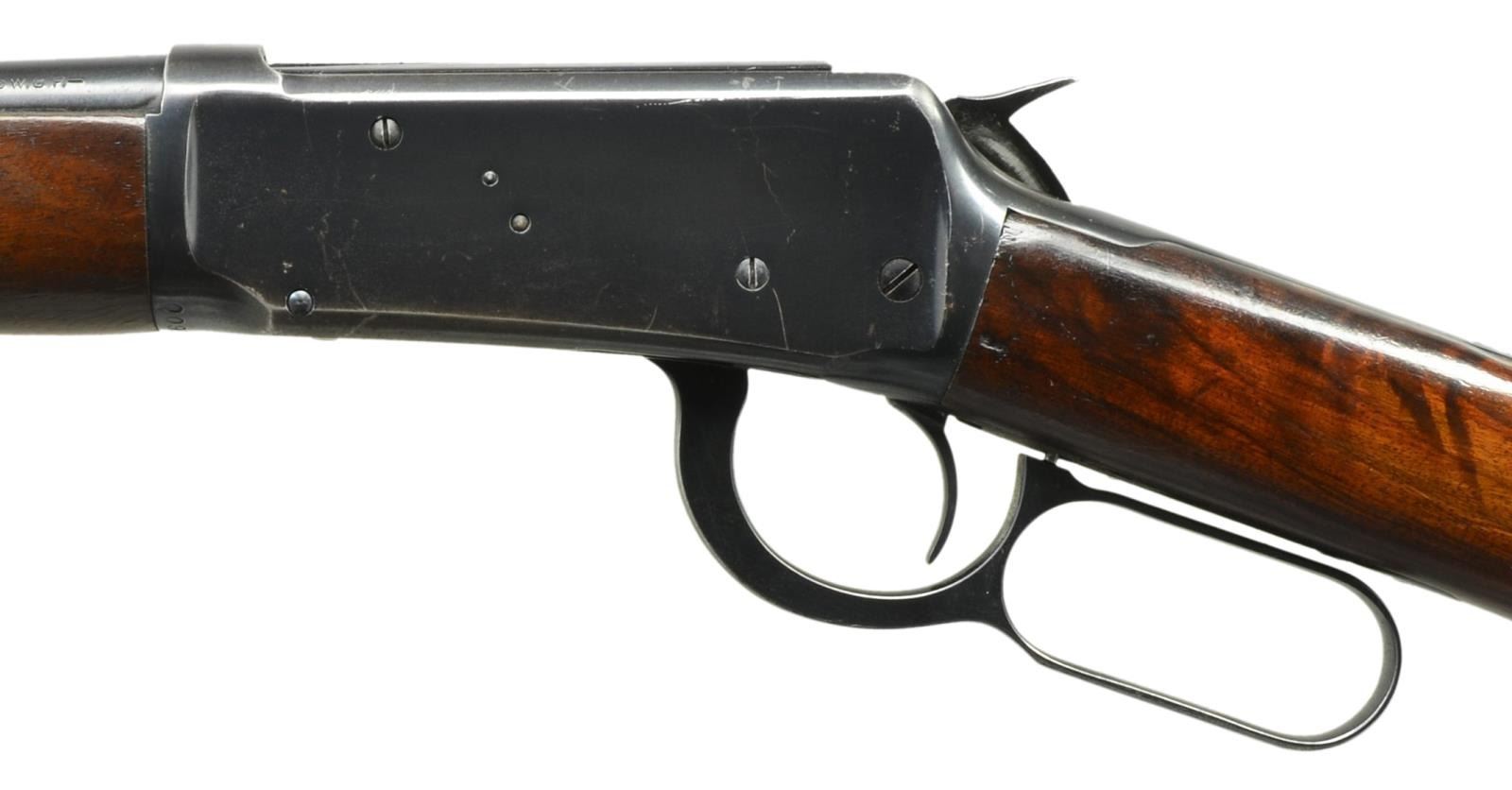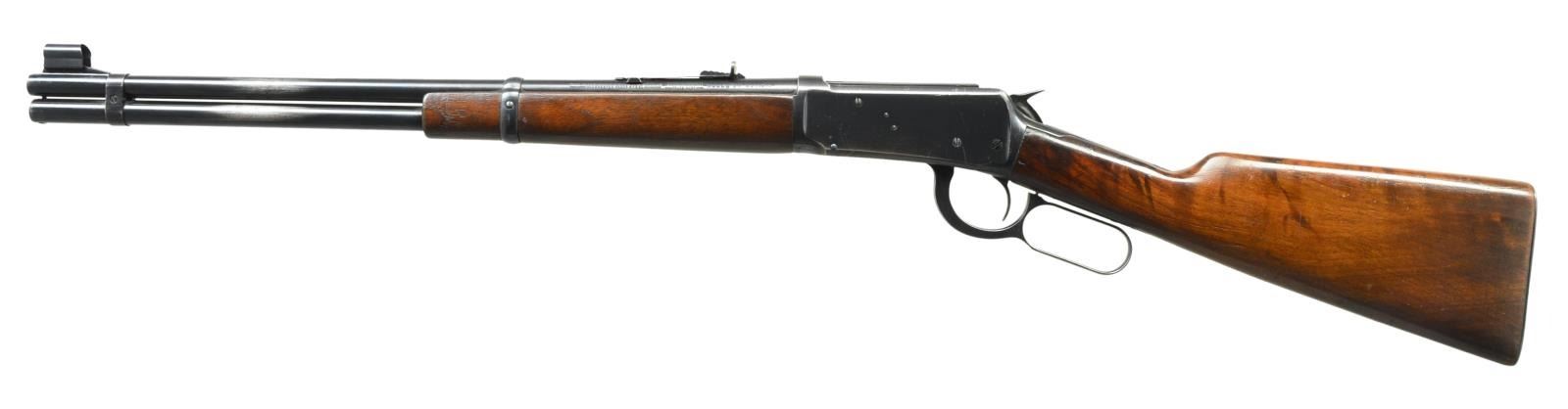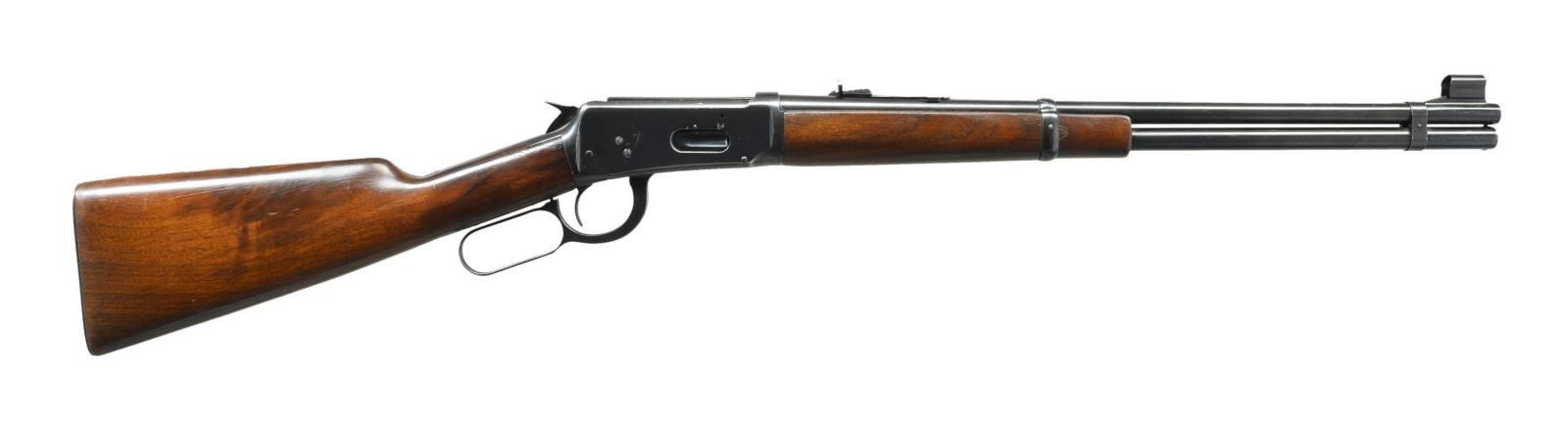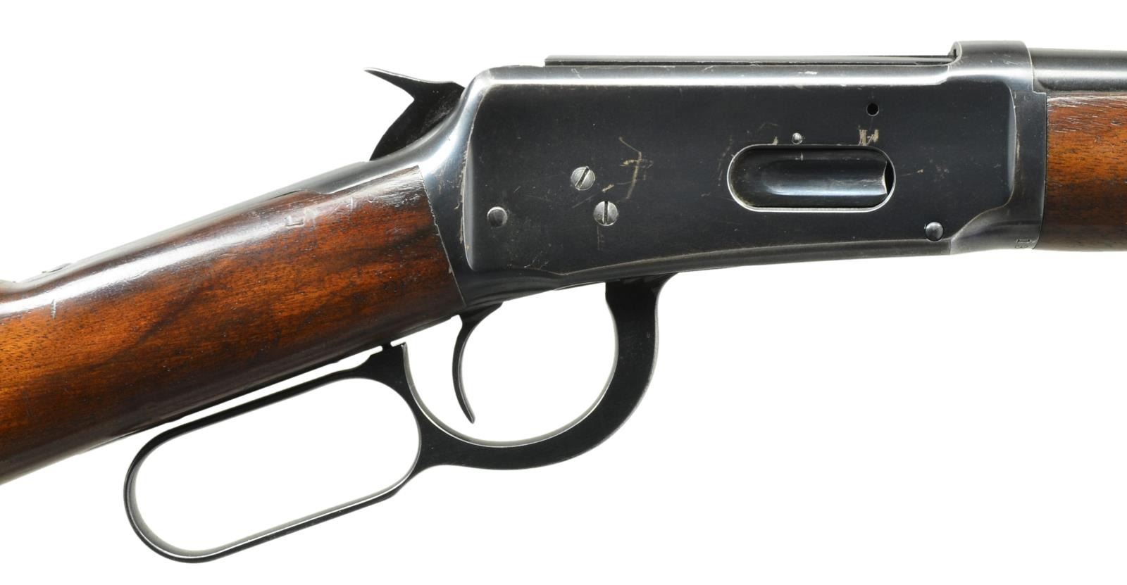 CARBINE. Cal. 30 WCF. S# 1375600. Bbl. 20" carbine style rnd. Hooded ramp bead front sight w/ sporting rear sight. Full length mag. w/ flat bbl. band as associated w/ WWII era production. Blue finish. Longwood forearm & straight grip stock of nicely grained walnut w/ checkered steel buttplate. CONDITION: over 80% lightly faded blue showing carry wear w/ scratches & marks. Original wood finish shows light wear scratches, handling marks & mildew spots. Bright bore w/ sharp rifling. (21-3664/DS). CURIO. $400-600.