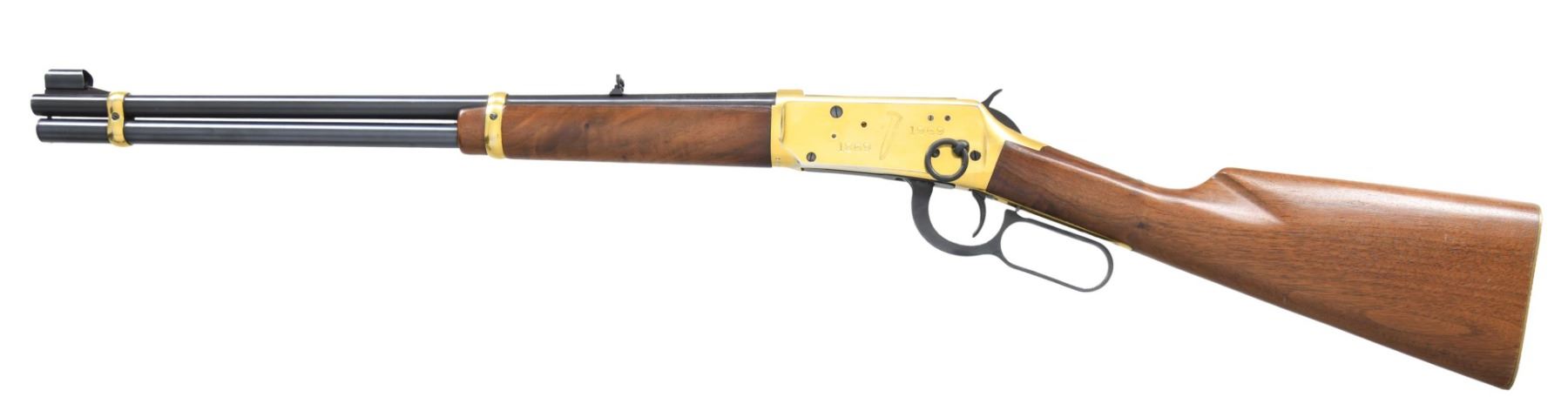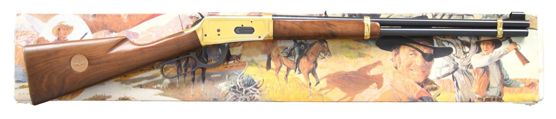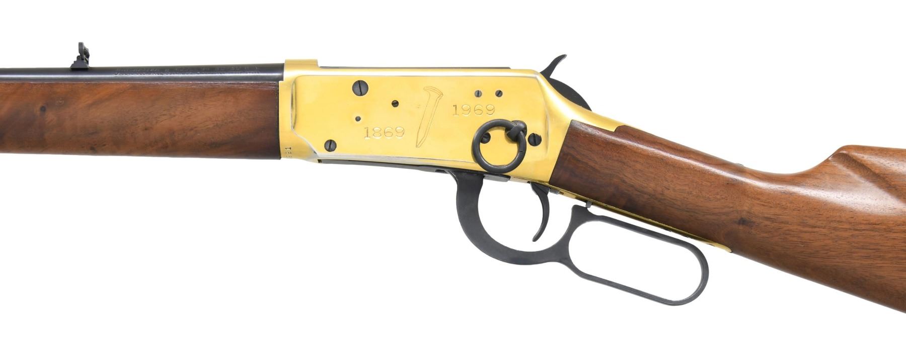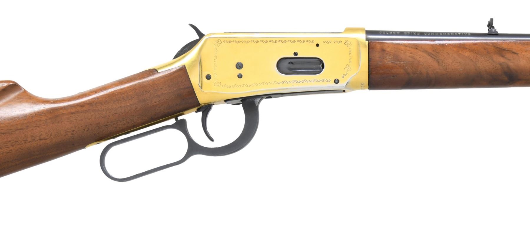 LEVER ACTION RIFLE WITH STYROFOAM INSERT & SLEEVE. Cal. 30-30. S# GS31921. Bbl. 20". Model 94 Golden Spike commemorative lever action rifle mfg. by Winchester. The left side of the bbl. is marked with the Winchester trademark logo, followed by the model and cal. designation above Winchester's mfg. information, with "GOLDEN SPIKE COMMEMORATIVE" marked on the right. The left side of the receiver is engraved "1869", followed by a railroad spike, and "1969", with decorative border engraving on the right, and "OCEANS UNITED BY RAIL" on the upper receiver tang. Receiver, bbl. bands, and buttplate exhibit a gold plated finish, with remaining metal components exhibiting a blue finish overall. Plain wood straight grip buttstock and forend. Right side of buttstock is inlaid with a commemorative gold medallion. Ramped, hooded, and brass beaded blade front sight, with flip-up U-notch rear sight. UNATTACHED ACCESSORIES: John Wayne commemorative styrofoam insert and cardboard sleeve. CONDITION: good, with metal components retaining the majority of their original factory finishes, exhibiting some superficial handling marks overall. Receiver and bbl. bands exhibiting some light to mild wear and thinning that shows through to silvering. Mirror bore, exhibiting scattered spots of light surface oxidation on the lands, while retaining well defined rifling throughout. Wood furniture shows scattered marks from handling and storage. Cardboard sleeve shows some wear, as well as some staining, and some tearing at the edges from handling and storage, but otherwise remains sturdy and serviceable. (25-1645/MLW). CURIO. $600-900.