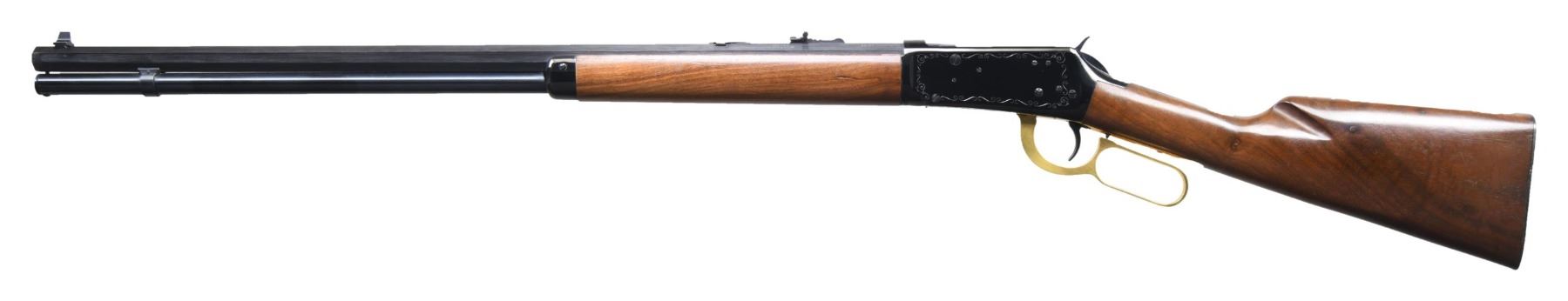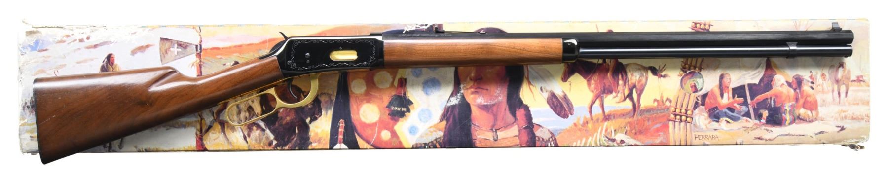 ACTION RIFLE WITH STYROFOAM INSERT & SLEEVE. Cal. 30-30. S# 3210109. Bbl. 26". Model 94 Winchester Classic lever action rifle mfg. by Winchester. The left quarter flat of the octagonal bbl. is marked with the Winchester trademark logo, followed by the cal. designation, with "Model 94 Winchester Classic" marked on the right quarter flat. Sides of receiver feature light scroll engraving. Receiver and forend cap exhibit a dark blue finish, with the bbl., mag. tube, trigger, hammer, and buttplate exhibiting a standard blue finish. Lever, lever link, and lower receiver tang exhibit a gold plated finish. Plain wood straight grip buttstock, with flat buttplate, and smooth wood forend. Dovetailed aluminum beaded blade front sight, with U-notch rear sight. UNATTACHED ACCESSORIES: Chief Crazy Horse commemorative styrofoam packaging and cardboard sleeve. CONDITION: metal components retain the vast majority of their original factory finishes, exhibiting some scattered superficial handling marks overall. Mirror bore, exhibiting well defined rifling throughout. Wood furniture shows scattered marks and impressions from handling and storage, but otherwise remains sturdy and serviceable. Cardboard sleeve exhibits some wear, with some fraying and tearing present along the edges. (25-1652/MLW). MODERN. $600-900.