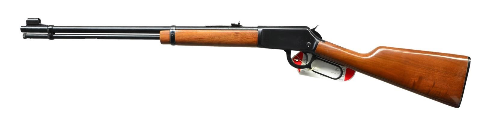 Cal. 22 S, L or LR. S# F341181. Bbl. 20 1/2". Early takedown rifle w/ uncheckered & glossy straight grip stock & forend. Hooded ramp fixed front & elevation adjustable rear sights. Blued finish & checkered Winchester buttplate. UNATTACHED ACCESSORIES: Original box serial numbered to the rifle, paperwork & hangtag. CONDITION: All aspects near excellent, showing little use. Bore is also near excellent, bright & shiny. (22-6321/CW). MODERN. $700-900.