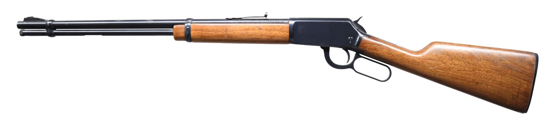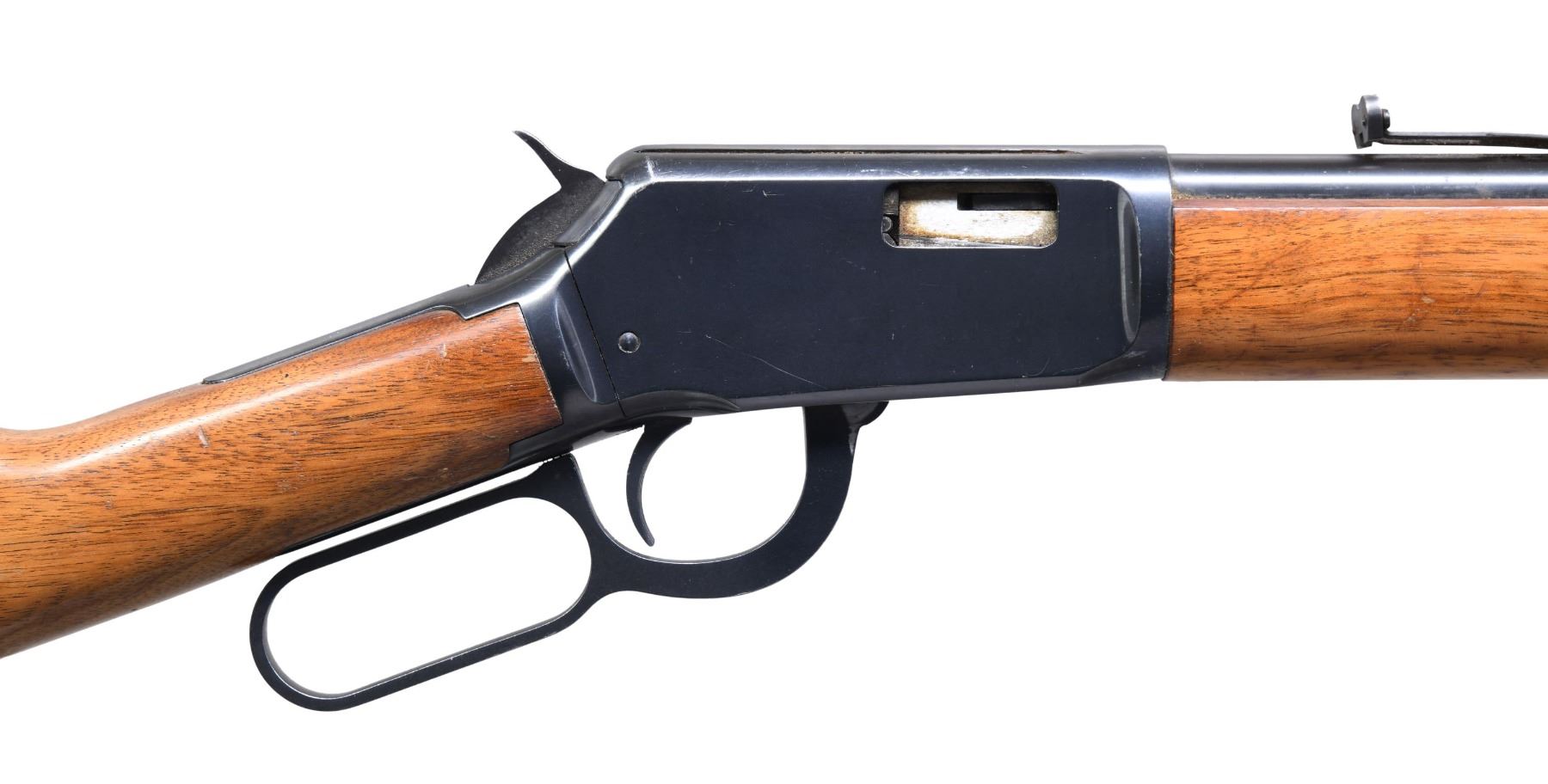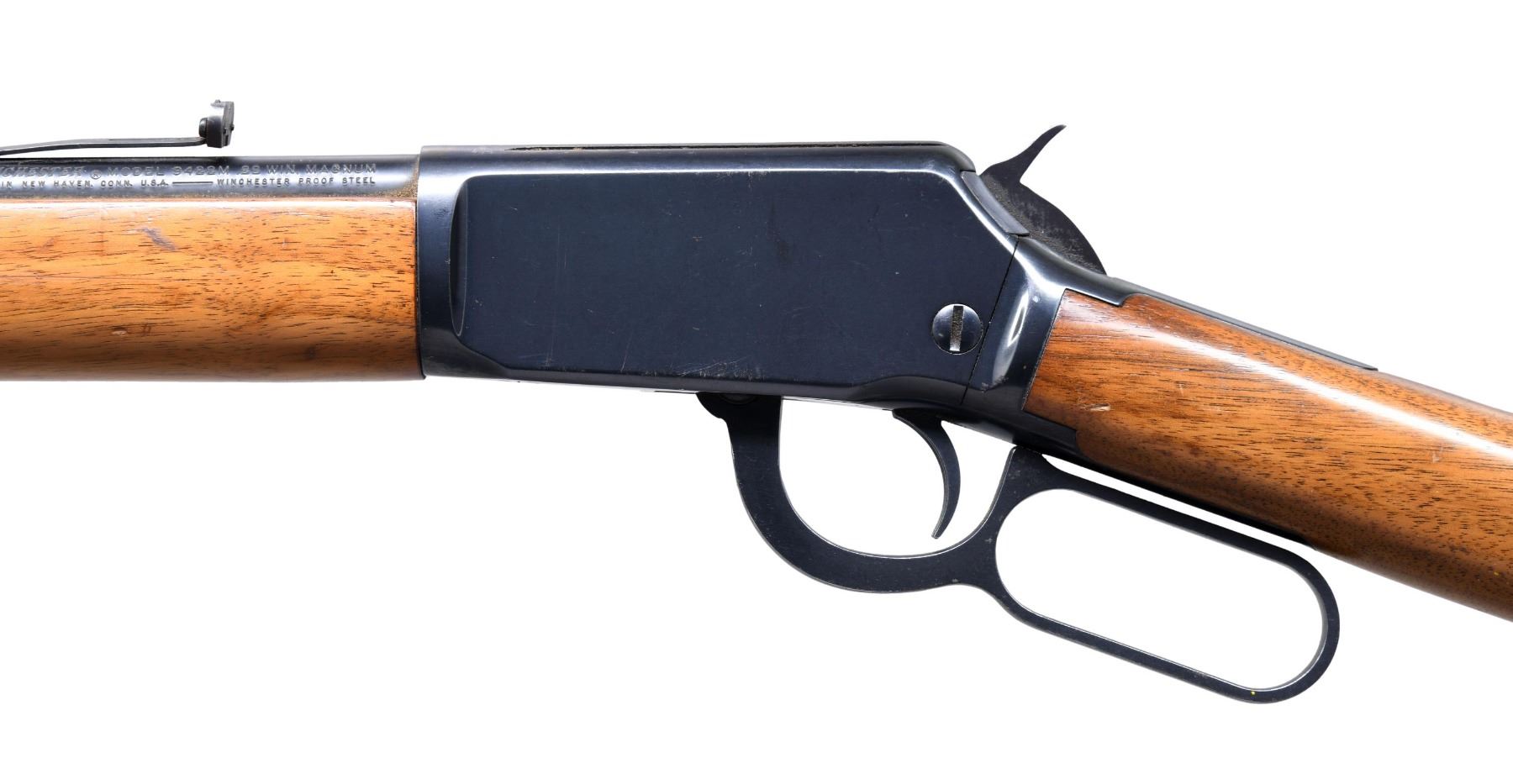 Cal. 22 Mag. S# F237154. Bbl. 20" w/ sporting sights & grooved receiver. Walnut forearm & stock w/ plastic buttplate. Mfg. 1976. CONDITION: 90% blue showing scratches & wear spots. Front sight is broken, rear sight is bent & missing elevator. Wood has worn finish showing numerous scratches, marks & small dents. Very good bore. (25-700/DS). MODERN. $700-1,000.
