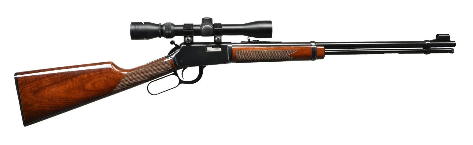 Cal. 22 Win Mag. S# F555586. Bbl. 20" round. Hooded ramp bead front sight with elevator adjustable sporting rear sight. Center Point 3-9X32 Matte finished scope with mill dot reticle on tip off mounts. Hammer has added extension. Band fastened carbine forearm and straight grip stock with plastic buttplate have gloss finish and cut checkering. CONDITION: over 98% original blue. Original wood finish shows a few small marks. Bright near excellent bore. Scope has clear optics. (22-5373/DS). MODERN. $750-1,250.
